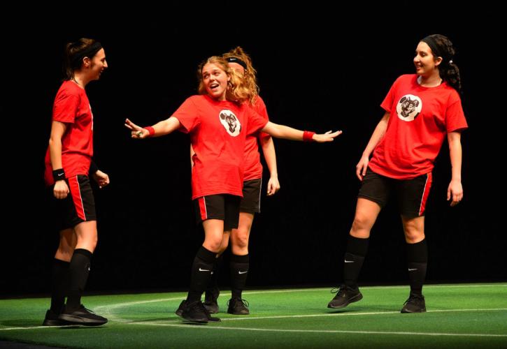 NACOGDOCHES, Texas – The Stephen F. Austin State University School of Theatre will present Sarah DeLappe’s play “The Wolves” at 7:30 nightly through Saturday, Oct. 5, in W.M. Turner Auditorium on the SFA campus. A finalist for the 2017 Pulitzer Prize for Drama, “The Wolves” is a coming-of-age play that follows the daily routines and conversations of nine girls on a soccer team who deal with big problems and tiny battles on the field and in life. In a scene from ‘The Wolves’ are, from left, Bridgeport freshman Elora Rogers; Irving senior Kathleen McNamara, Lufkin sophomore Britney Day (background); and Richmond senior Harsa Rutherford. Single tickets are $15 for adults, $10 for seniors and non-SFA students and $7.50 for youth. Tickets for SFA students are $5. For tickets or more information, call the SFA Fine Arts Box Office at (936) 468-6407 or visit www.theatre.sfasu.edu. The play is recommended for mature audiences.