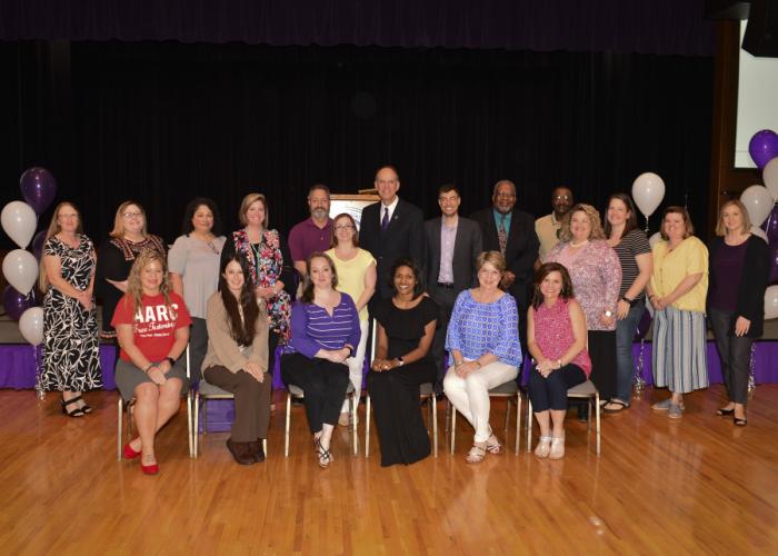 Pictured standing, from left, are honorees Bradford, Wilkerson Williams, Ramirez, Middleton, Ghiringhelli, Mitchum, SFA Interim President Steve Westbrook, honorees Derrick, Baker, Upshaw, Johnson, Creel, Zawlocki and Carmona. Seated, from left, are Weatherford, Story, DeWitt, Darden, Faires and Beckwith.