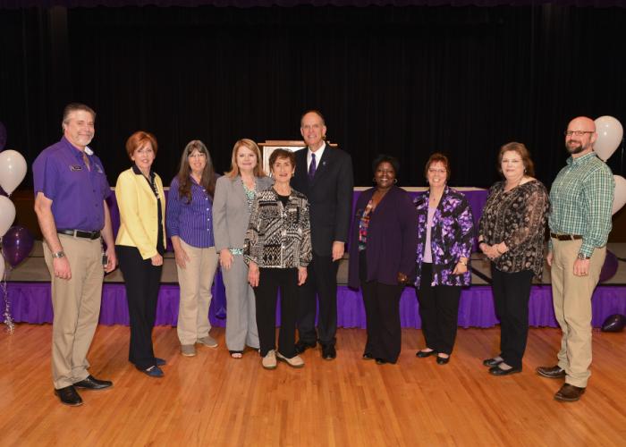 Retiring Stephen F. Austin State University staff members were honored for their service to the university. Honorees included Tyrone Patton, student center administration; Deborah Sellman, business affairs; Linda Bianco, procurement and property services; Laura Anderson, biology; Karen Brasher, Michael Dogget and Ramon Rocha, residence life; Randell Butler, Jo Ann Deckard and Brad Stapleton, physical plant; Charles Feazell, University Police Department; Matthew Fenley, Robert Hill, Sean Lonergan and Gregory Payne, athletics; Dixie Groll, liberal and applied arts; David Justus and Donna Mettier, information technology services; Shelly Lackey, university affairs support systems; Donna Rocka, computer science; Judy Eddings and Aleta Spivey, human resources; Anne Uhyrek, controller; Diane Stepp and Bonnie Walker, registrar; and Mary White, student center administration. Pictured with Dr. Steve Westbrook, SFA interim president, center, are, from left, Patton, Sellman, Bianco, Stepp and Eddings.