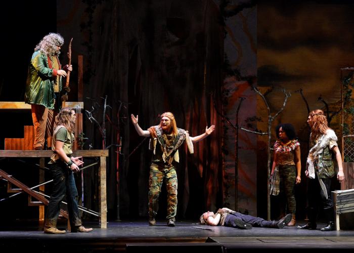 NACOGDOCHES, Texas – Only a few opportunities remain to see the Stephen F. Austin State University School of Theatre’s presentation of William Shakespeare’s “Titus Andronicus.” The play is at 7:30 nightly through Saturday, Nov. 16, in W.M. Turner Auditorium on the SFA campus. “Titus Andronicus” chronicles Rome’s honored general as he returns home from war and begins a cycle of revenge filled with bloody deaths as punishment for a series of committed wrongs. In a scene from the play are, from left, Brownsboro freshman Levi Laymance; Cushing freshman Drake Willis; Hawkins freshman Triston Dodson; Ferris sophomore Cameron Ralston; Houston sophomore Fatimah Green; and Forney sophomore Trace Killian. Single tickets are $15 for adults, $10 for seniors and non-SFA students and $7.50 for youth. Tickets for SFA students are $5. For tickets or more information, call the SFA Fine Arts Box Office at (936) 468-6407 or visit www.theatre.sfasu.edu. The play is recommended for mature audiences.