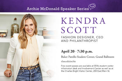Fashion designer, CEO and philanthropist Kendra Scott will headline the 2020 installment of the Archie McDonald Speaker Series in April at Stephen F. Austin State University.
