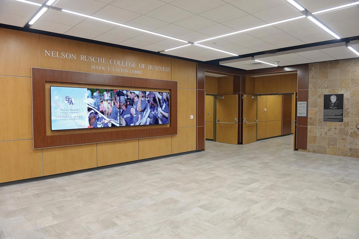 Layton led an initiative at Deloitte to recruit and hire SFA business graduates. Many of Layton’s friends and colleagues, in honor of his loyalty and dedication to his profession, made contributions that allowed the lobby to be named in his honor. The lobby is equipped with two 75-inch digital signs, which are used to communicate news and opportunities to students.
