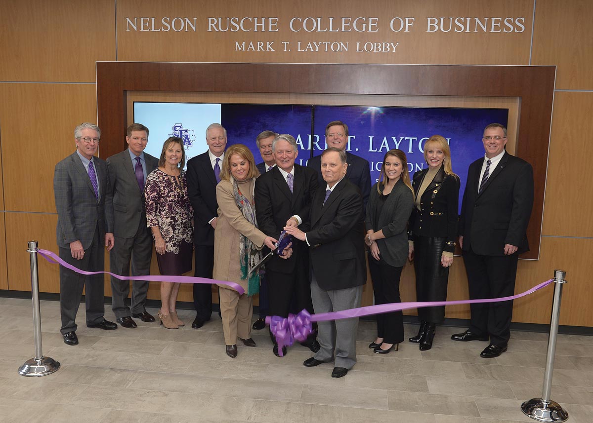 “Mark Layton served in many senior leadership roles at Deloitte, including his role as managing partner of Deloitte’s Dallas office,” said Jason Downing, Deloitte North Texas managing partner and also an SFA alumnus. “As a fellow SFA graduate, it gives me a great sense of pride to see Mark’s legacy celebrated in the university that prepared both of us for our business careers at Deloitte. We commemorate Mark’s retirement by dedicating the Mark T. Layton Lobby to the students who will walk these halls for generations to come.”
