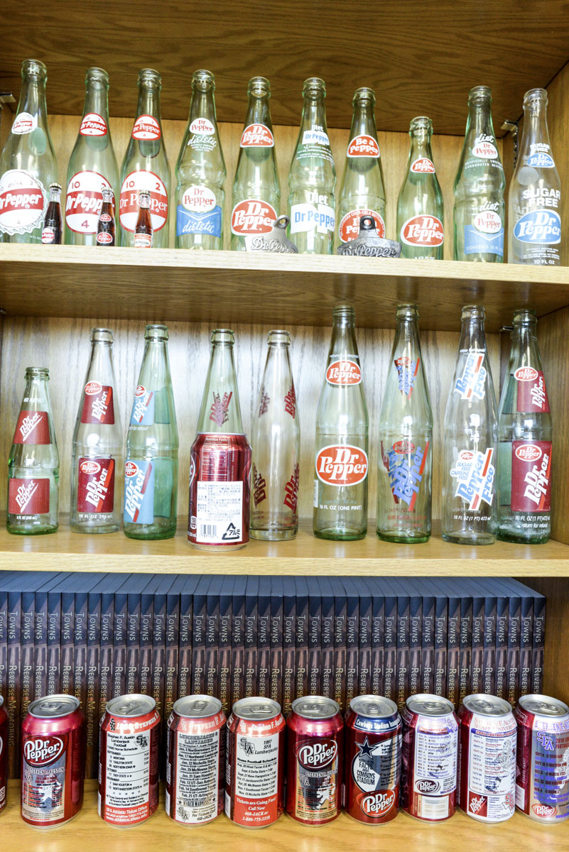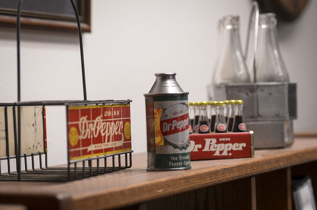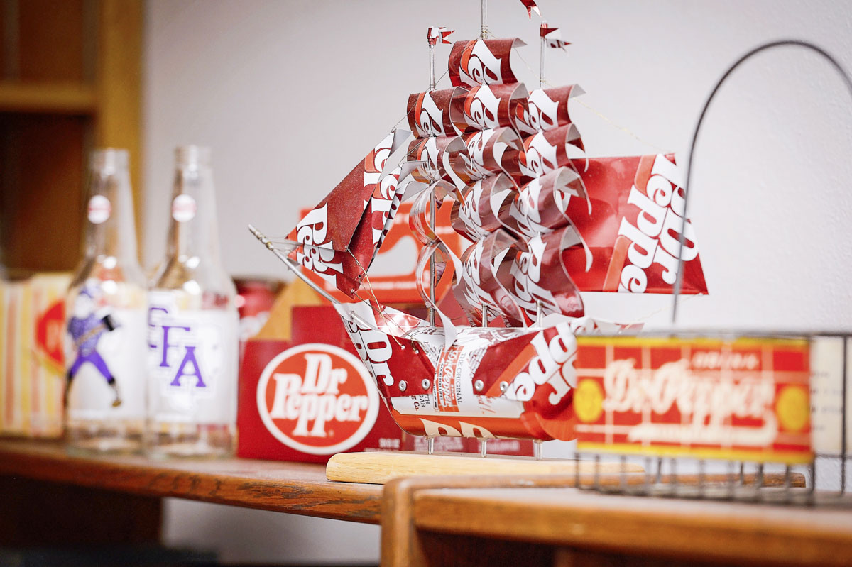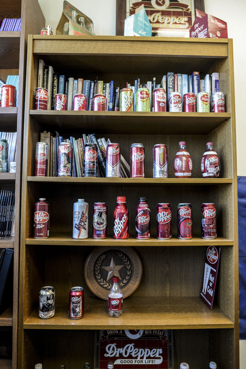Various Dr Pepper items are proudly displayed on the shelves in Towns’ office, including the first can Dr Pepper produced, metal bottle carriers from the early days of Dr Pepper, cans Towns purchased while visiting other countries, sports-related cans and bottles, clocks, gum packages, a sailing ship constructed from Dr Pepper cans, stained glass, and many others.
