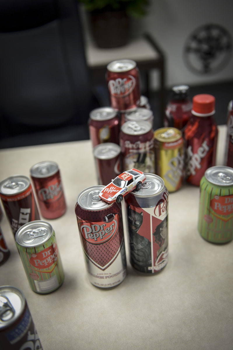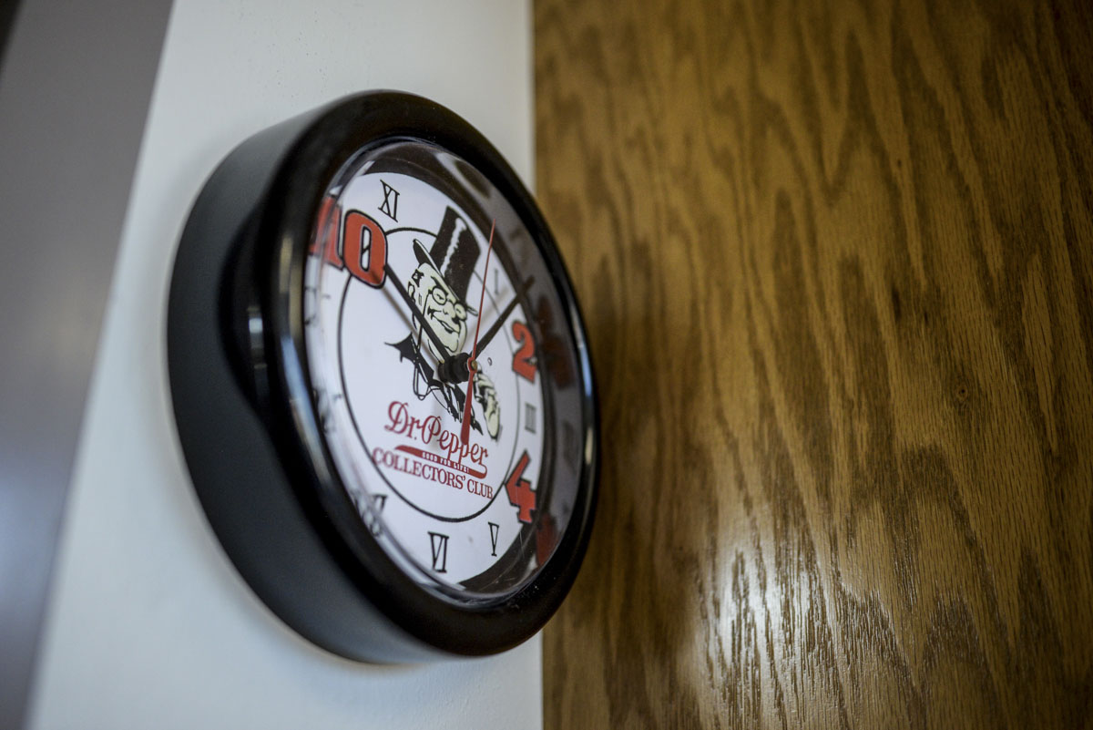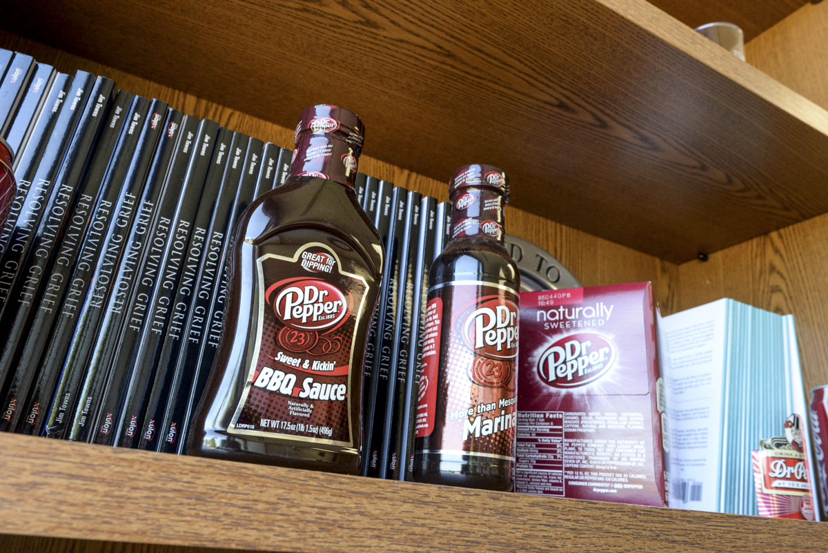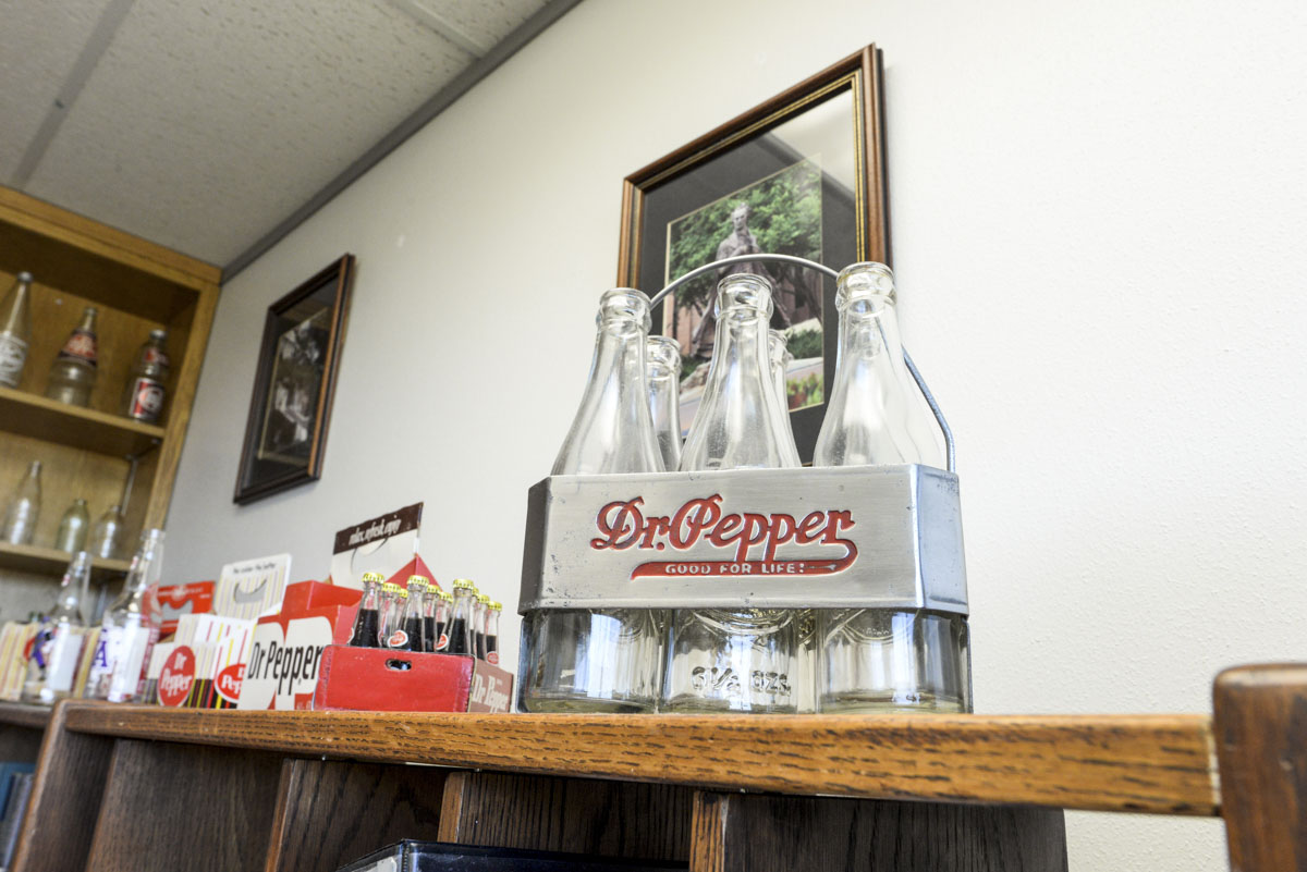 Various Dr Pepper items are proudly displayed on the shelves in Towns’ office, including the first can Dr Pepper produced, metal bottle carriers from the early days of Dr Pepper, cans Towns purchased while visiting other countries, sports-related cans and bottles, clocks, gum packages, a sailing ship constructed from Dr Pepper cans, stained glass, and many others.
