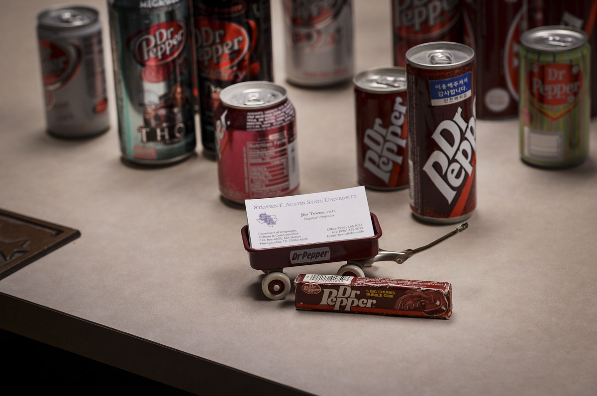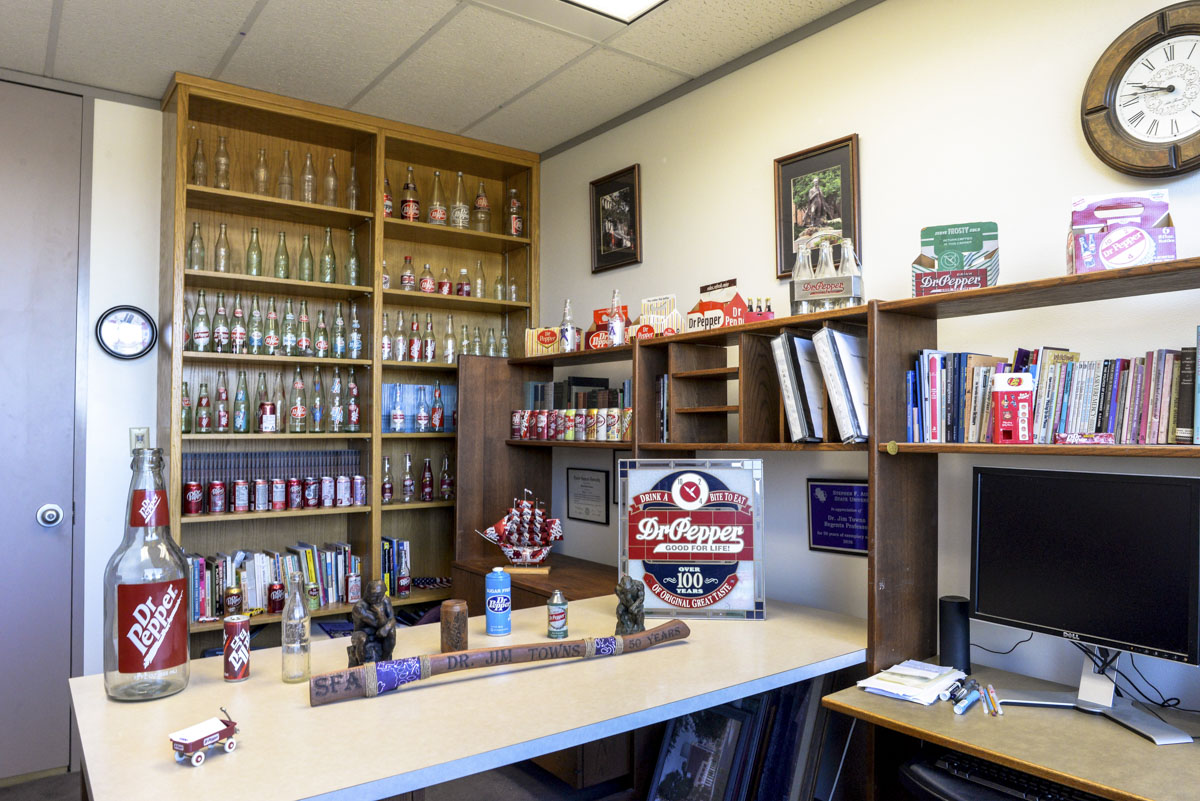 If you want to see the world’s most impressive collection of Dr Pepper memorabilia, you’ll need to travel to the Dr Pepper Museum in Waco. Or, you can save yourself the trip and visit the office of Dr. Jim Towns, SFA professor of communication.