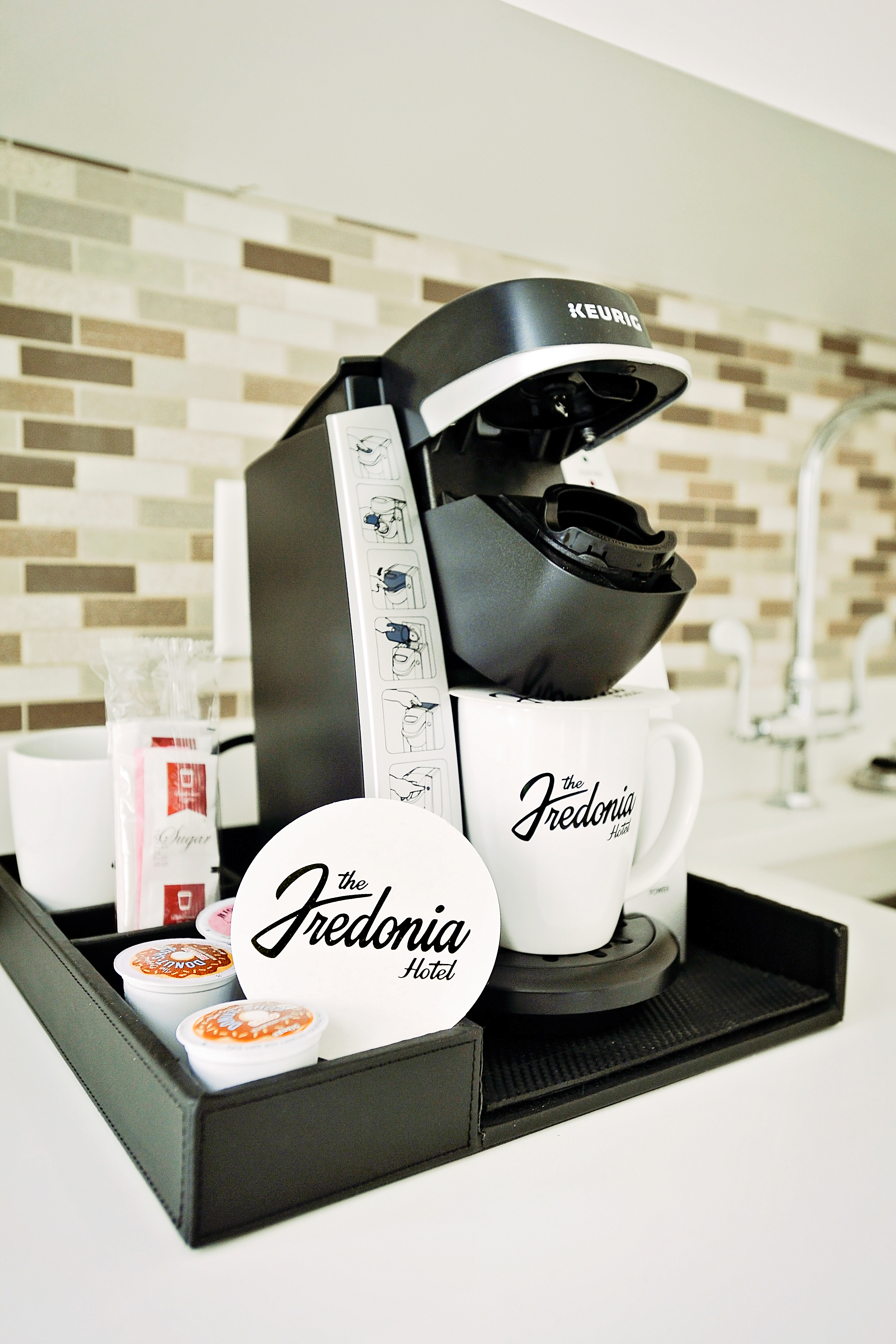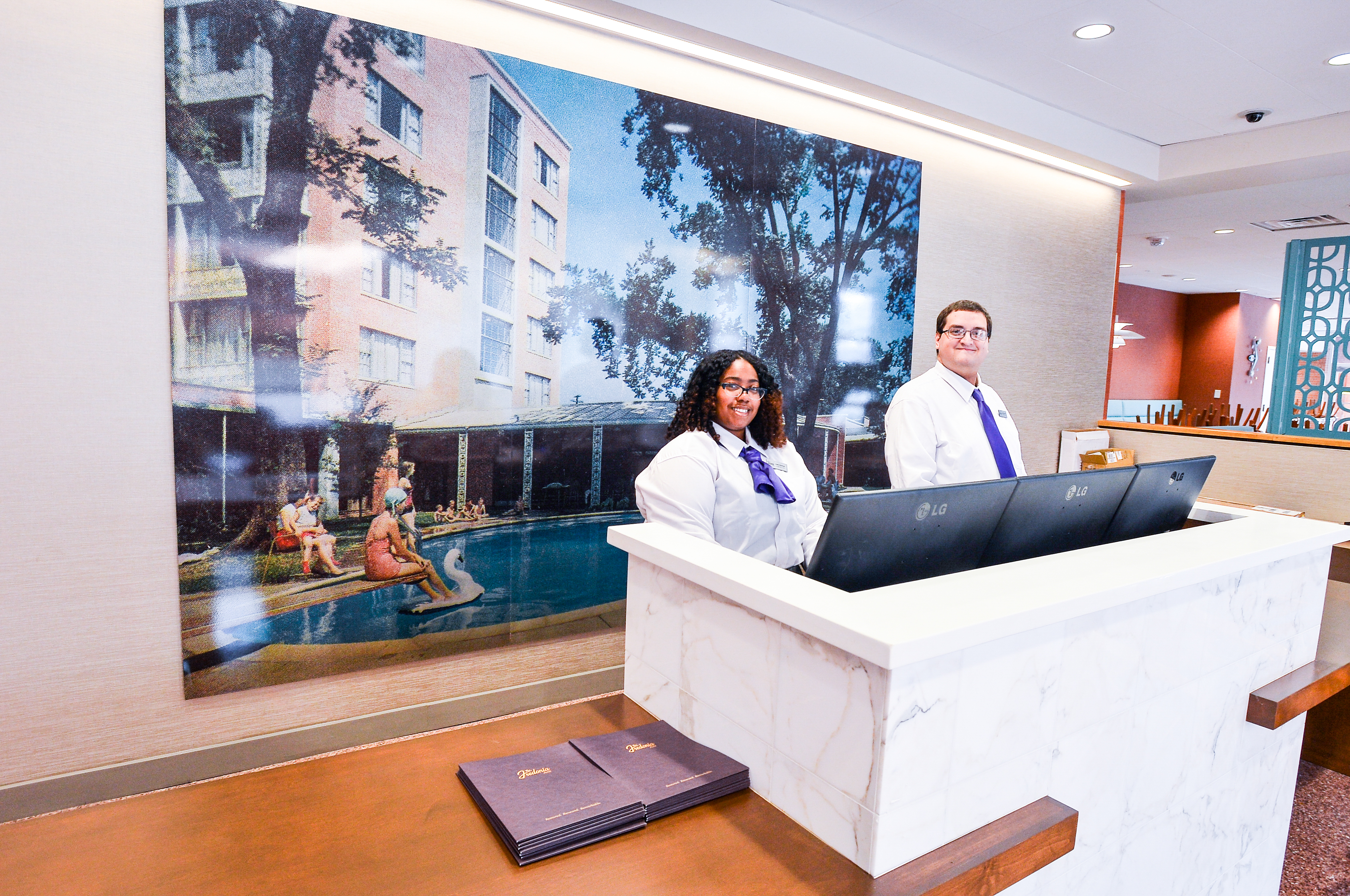 Behind the front desk, a giant vintage photograph pays homage to the building’s history and welcomes guests to check in and check out the “restored, renewed, remarkable” Fredonia Hotel.