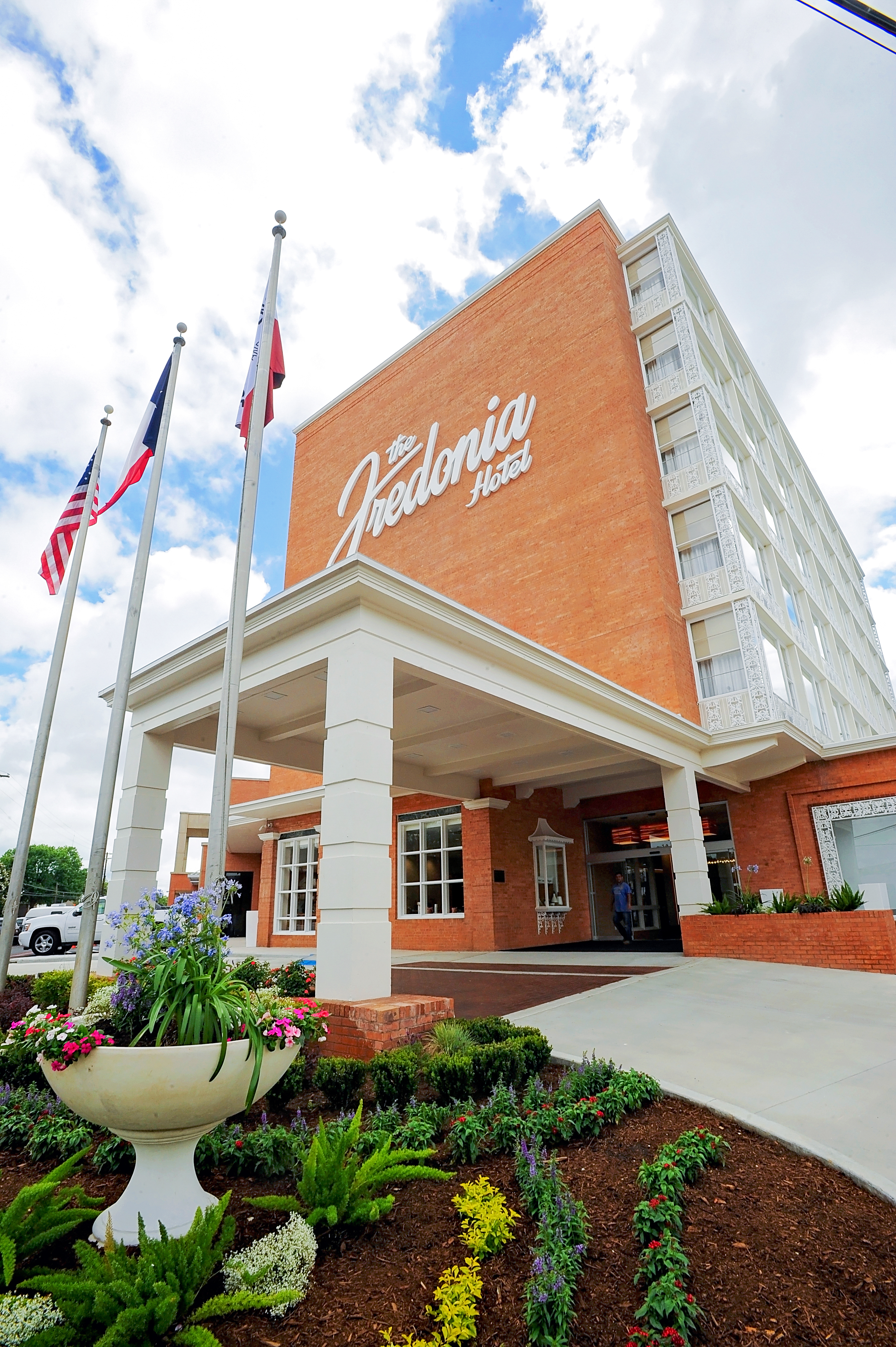 The Fredonia Hotel has a full-service concierge, convention center, banquet facilities, and fitness and business centers. Dining options include the Republic Steakhouse, a fine-dining chophouse; 1st City Café, a casual dining experience with farm-to-table Southern cuisine; and the iconic Nine Flags Bar. A special roast from local coffeehouse Java Jacks is served, and outside, visitors can enjoy a new pool with a video screen, cabanas and a fire pit.