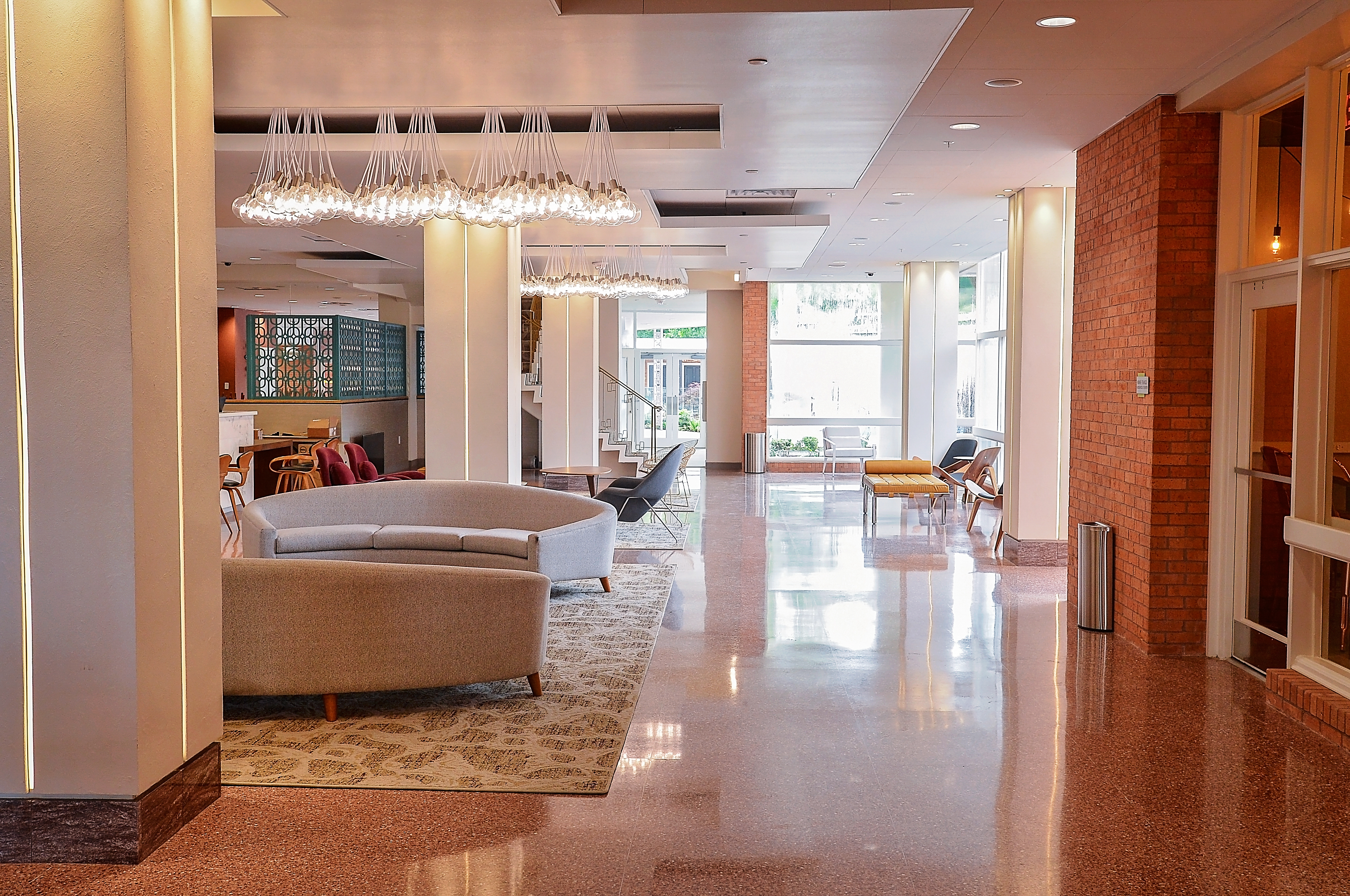 While the hotel may look much the same on the outside, the interior showcases a completely new look. Walking into the lobby, the hotel is almost unrecognizable with futuristic lighting and a mixture of 1950s seating and midcentury modern decor.