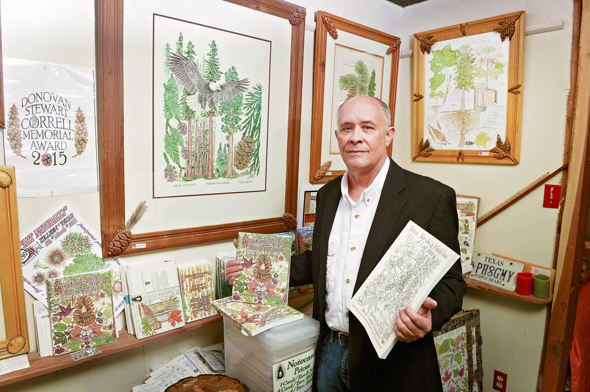 Cunningham recalls his interests in forestry and art first combining when he was required to draw many species of pine cones while enrolled in a dendrology forestry class at SFA under the instruction of Dr. Harry Wiant.