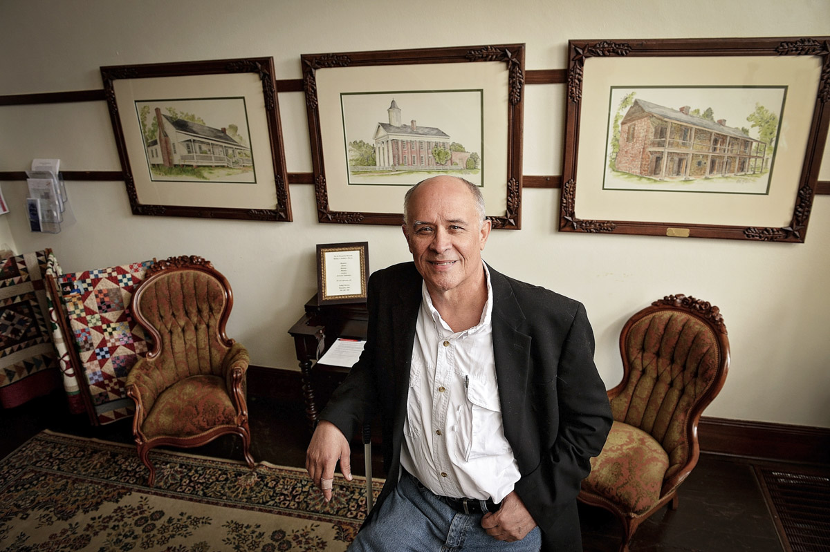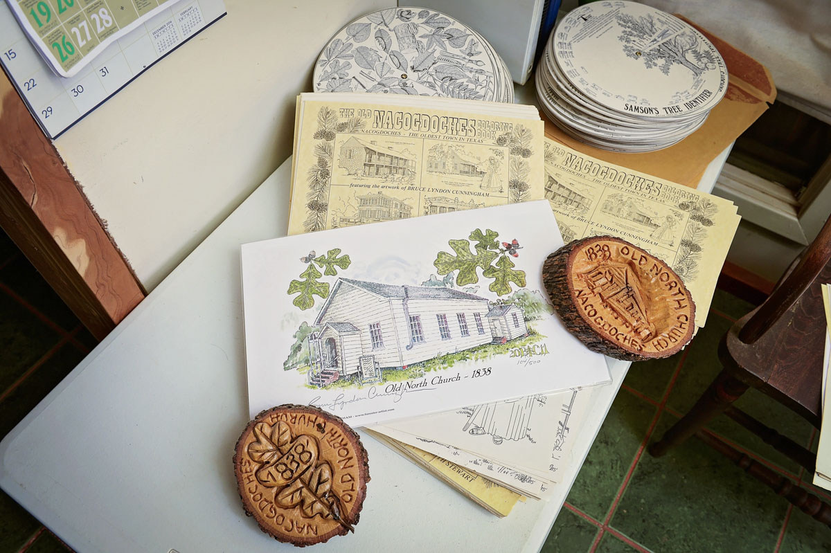 Today, his two-story home in Texas’ oldest town doubles as his studio and workshop, where the entryway showcases myriad examples of his talent, including more than 30 framed illustrations, various woodcarvings and notable awards. His workshop, a large open room located at the back of the home, warehouses several types of wooden planks and tables supporting sawdust and tools.