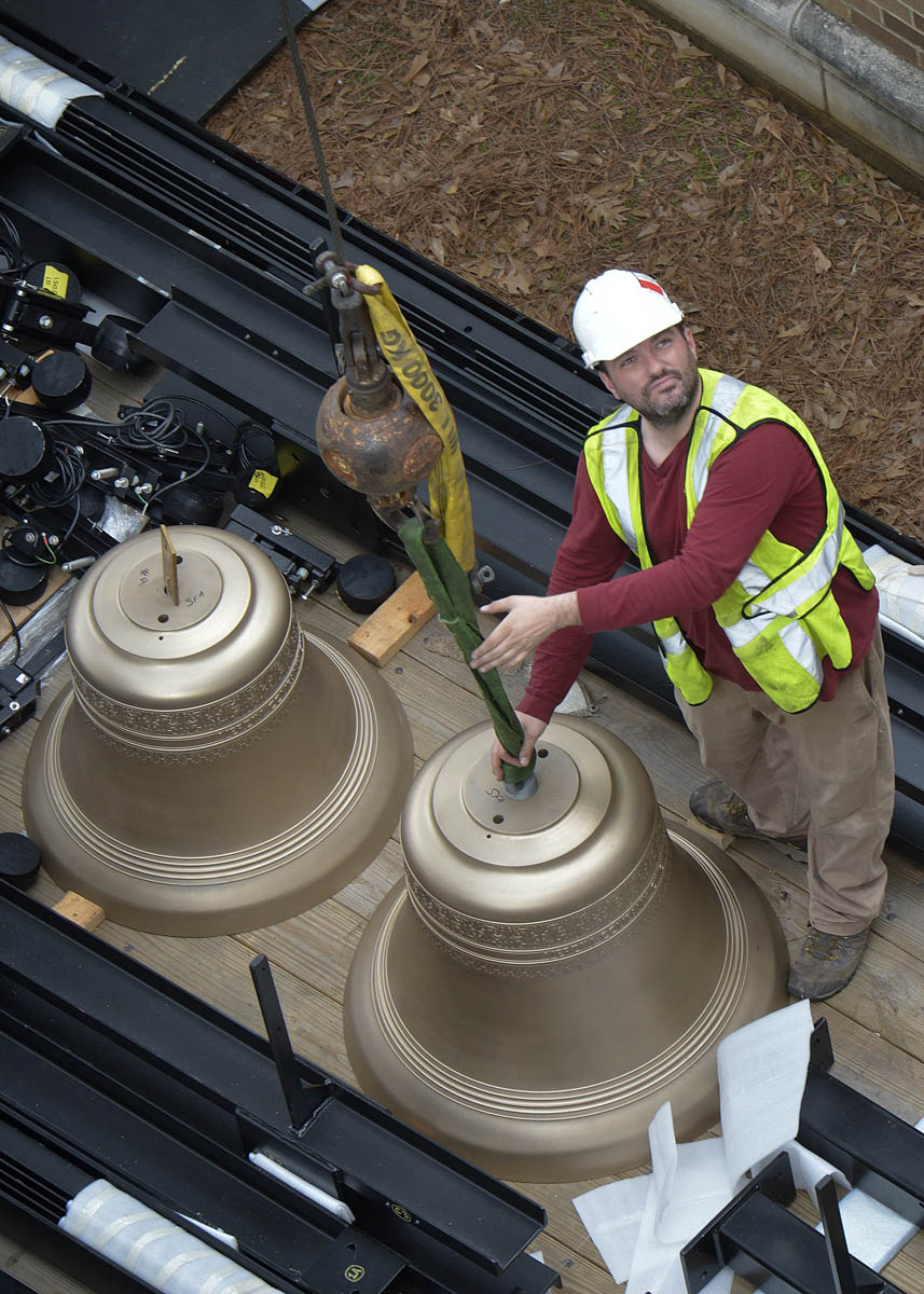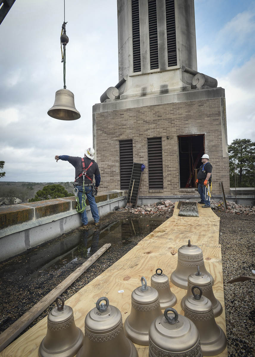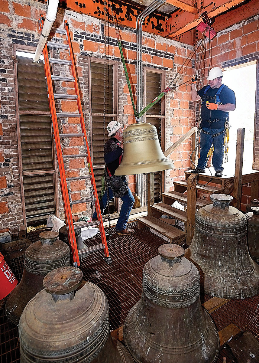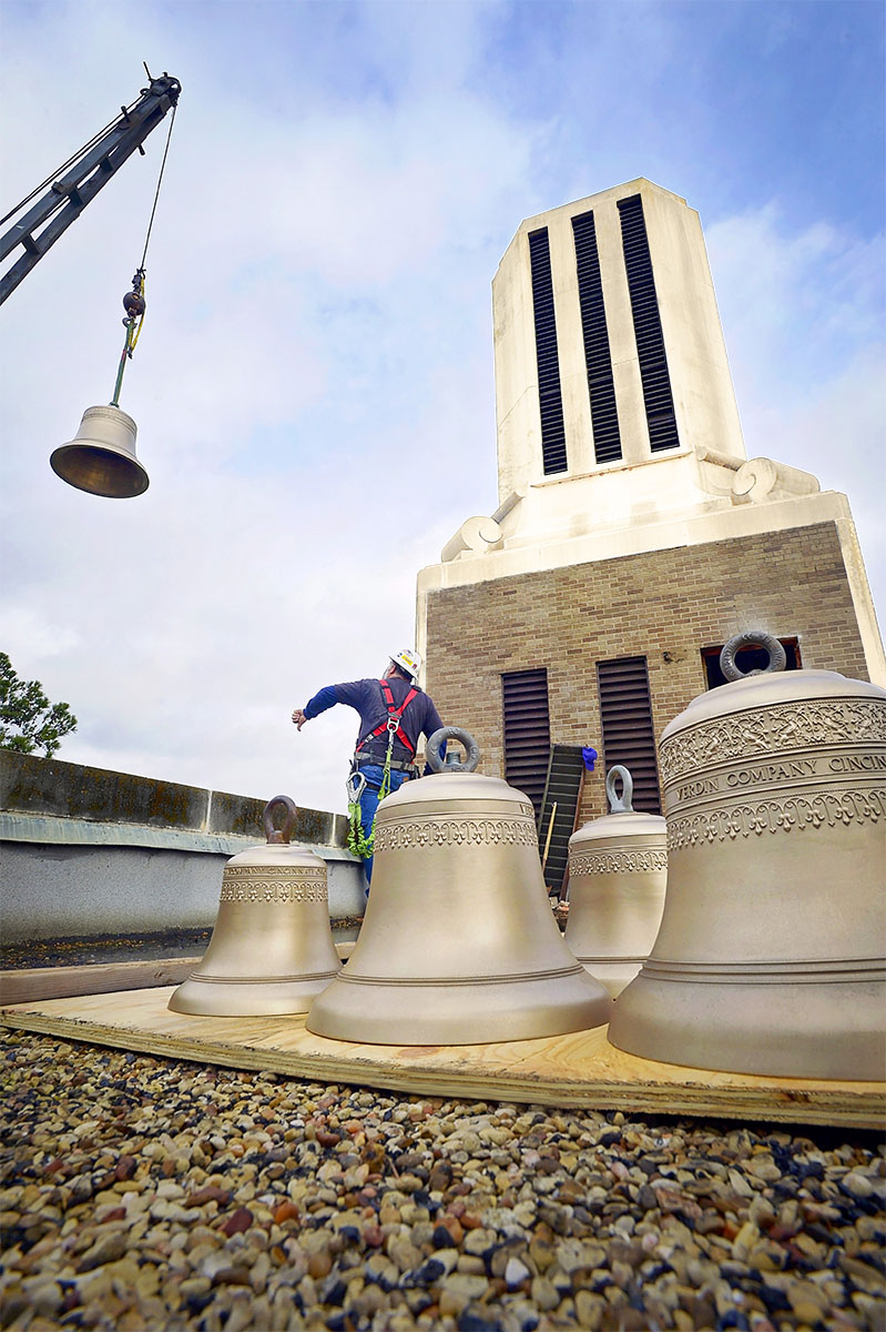 The Verdin Bell and Clock Company, the installers of the original bell tower in 1959, completed the project in two phases. In August 2016, the existing bells were dismantled from the frame and relocated to a temporary staging area in the tower. The original frame also was removed. In January, Verdin installed a new frame, delivered the 10 new bells, ranging from 84 to 977 pounds, and installed the entire 25 bells and new strikers on each. A.G. Perry and Son Cranes completed the tedious and skillful delivery of these items, from ground to rooftop to inside the bell tower.