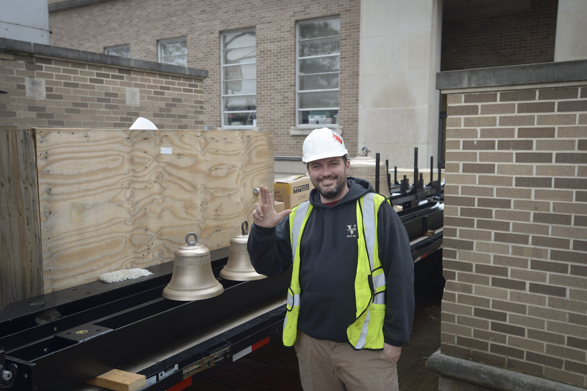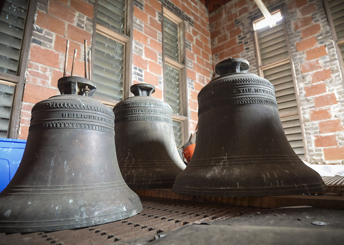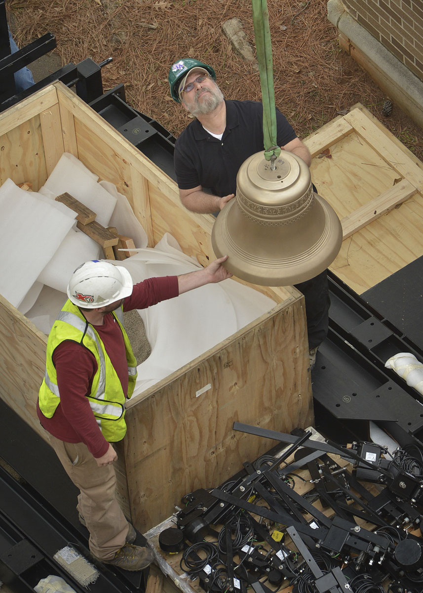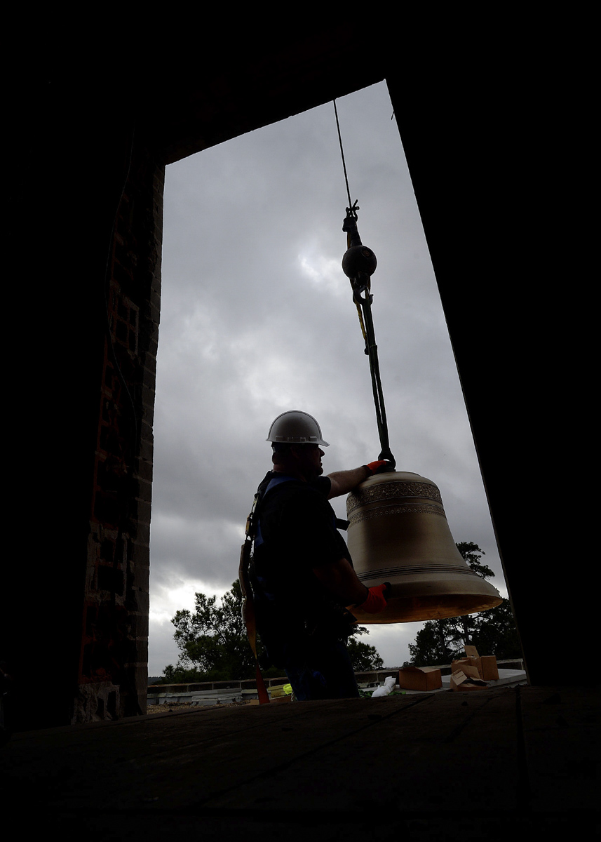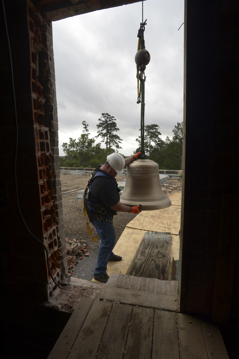The Verdin Bell and Clock Company, the installers of the original bell tower in 1959, completed the project in two phases. In August 2016, the existing bells were dismantled from the frame and relocated to a temporary staging area in the tower. The original frame also was removed. In January, Verdin installed a new frame, delivered the 10 new bells, ranging from 84 to 977 pounds, and installed the entire 25 bells and new strikers on each. A.G. Perry and Son Cranes completed the tedious and skillful delivery of these items, from ground to rooftop to inside the bell tower.