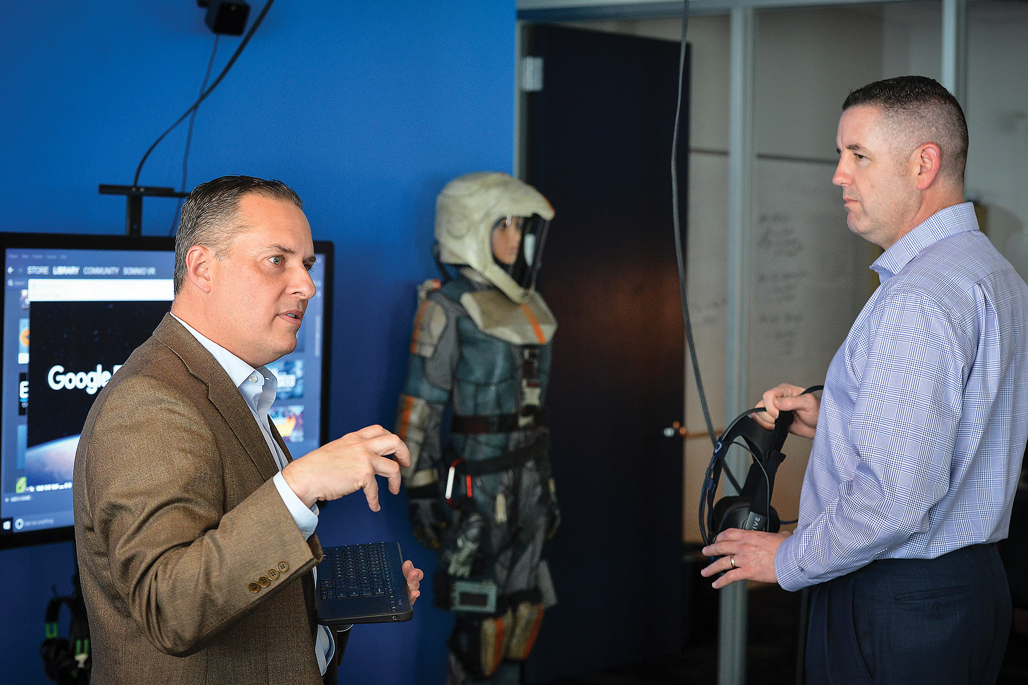 The modern space resembles something from Silicon Valley, replete with glassed-in meeting rooms, a virtual reality area, and a cozy break room with tabletop shuffleboard and a nearly full-service kitchen. The office’s innovative atmosphere is reminiscent of the company’s beginnings when three SFA alumni started the digital marketing company at a time when marketing was done almost entirely in print.