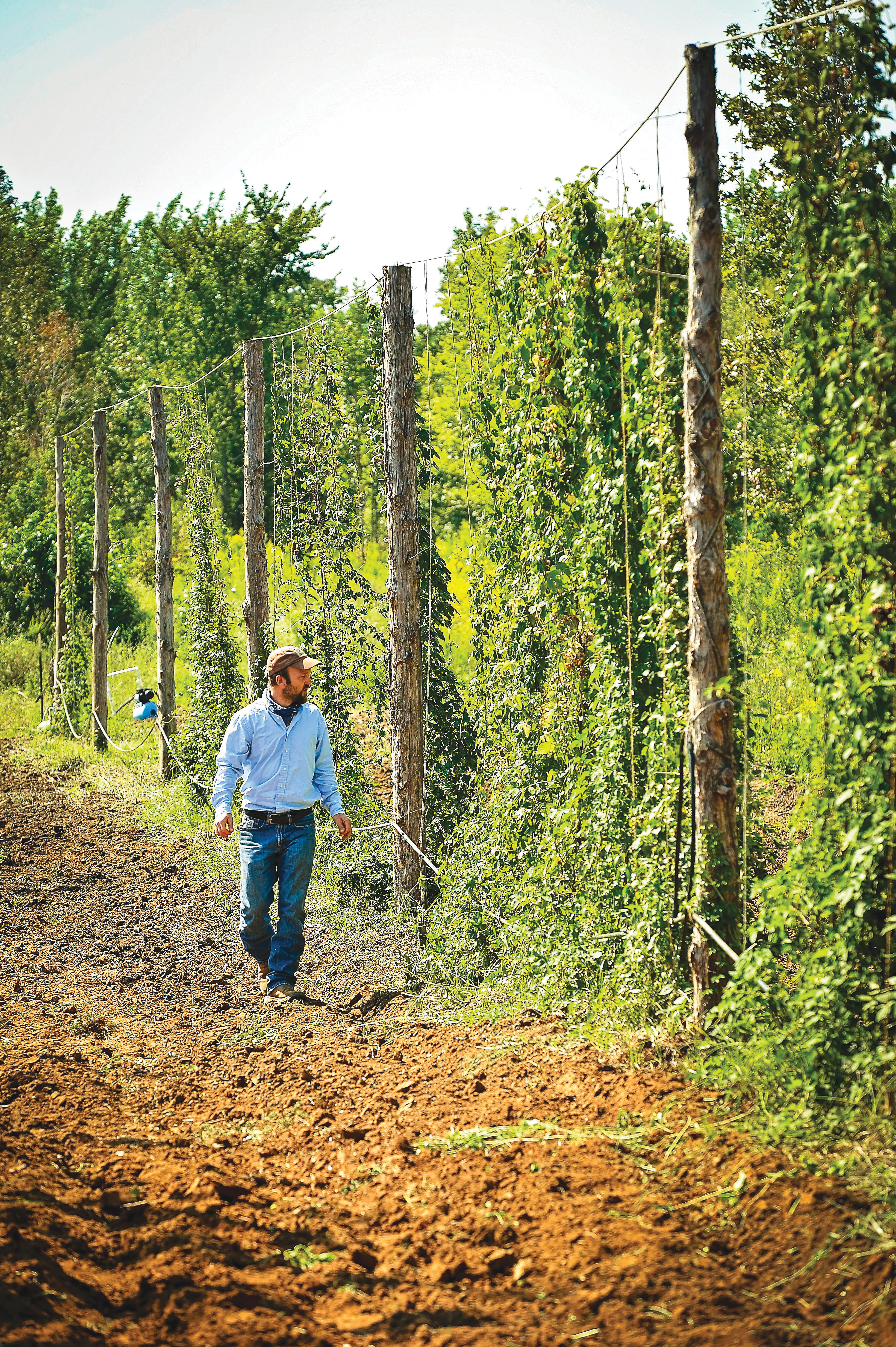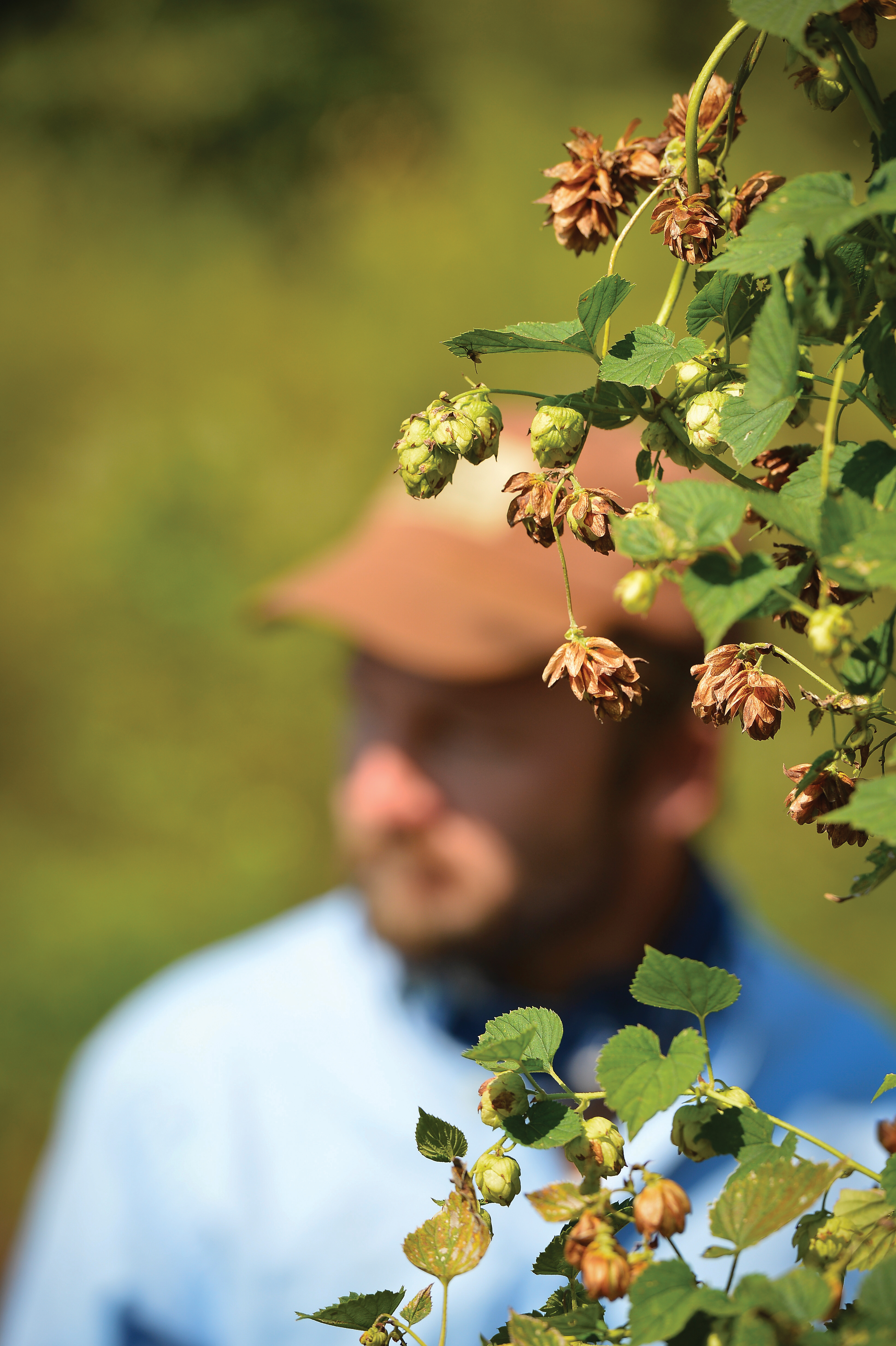 Despite being past peak season, the green columns of hop plants at Polk-Sharp Farm filled the balmy fall air with a mild citrus scent that quickly amplified as John Elkins ’11 & ’14 gingerly plucked a flower from a plant twining well above his head and pulled it apart with his fingers.