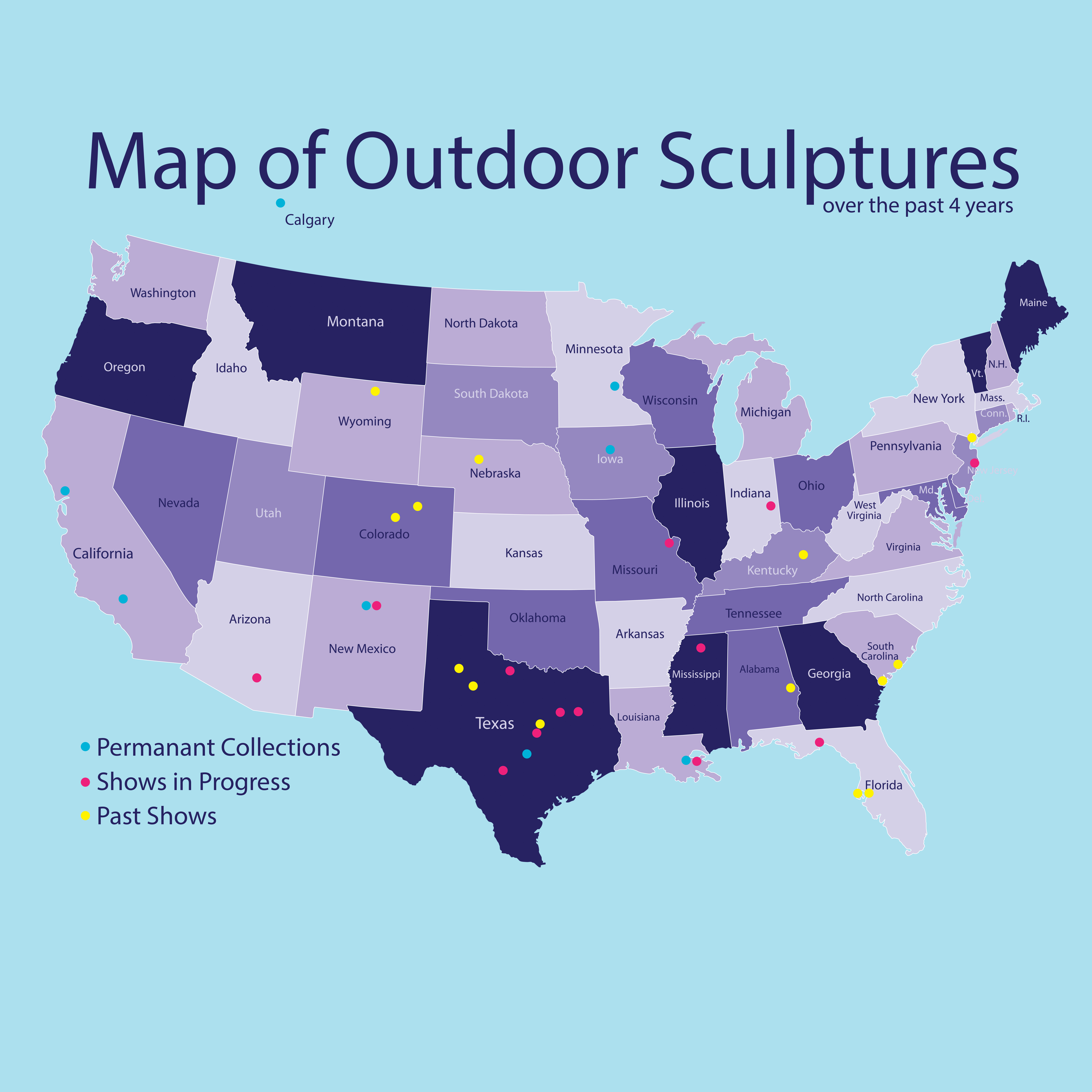 Since his first exhibition in 1998, his work has appeared in both solo and group shows across America, Canada, Europe, Mexico and Asia. He has works in public and private collections throughout the U.S.