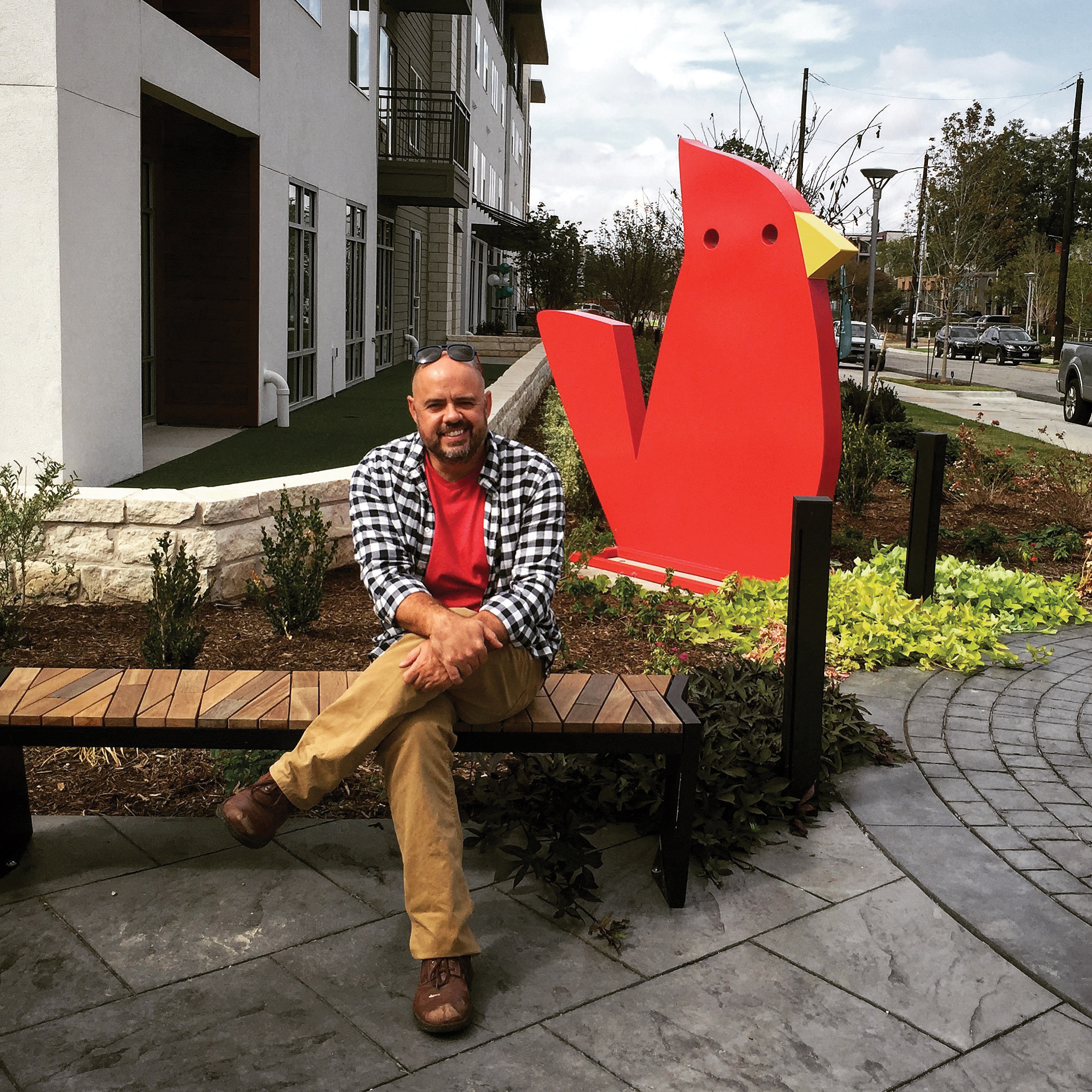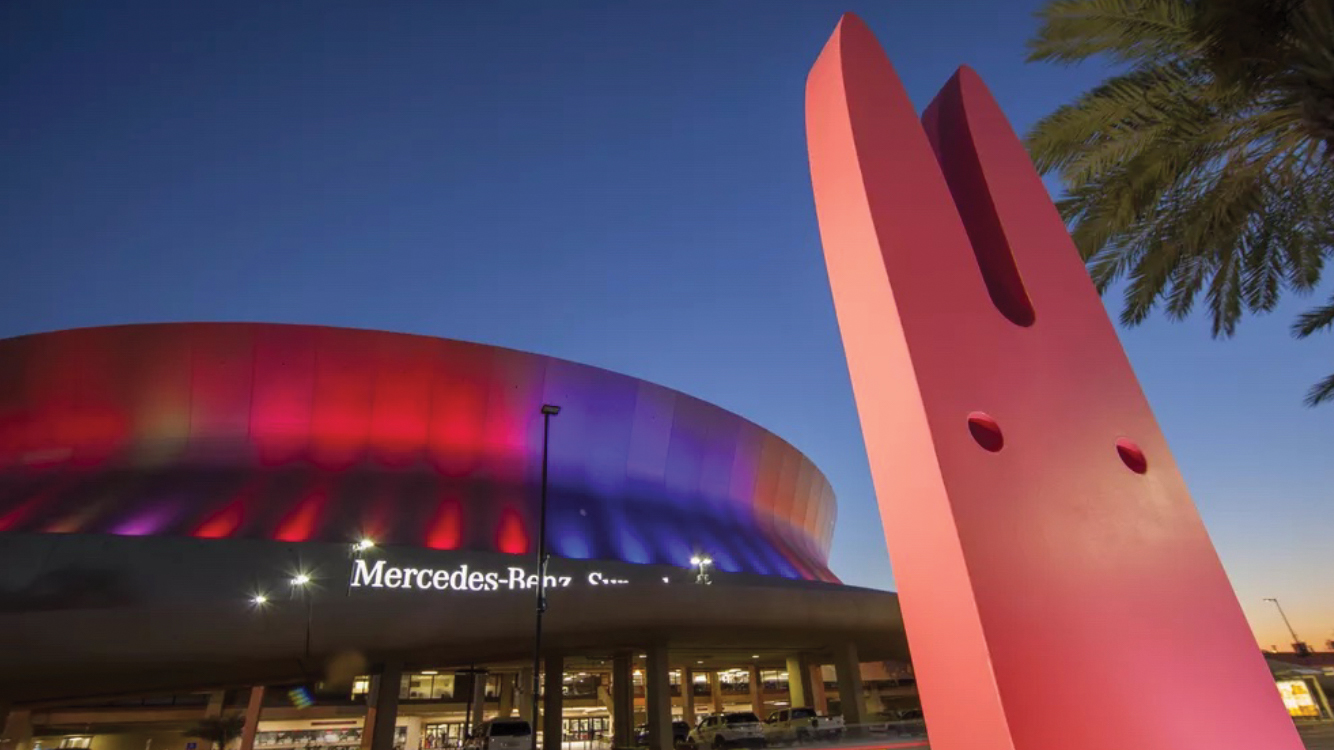 And if you’ve driven through Boerne, Texas, and seen the giant purple bull sculpture sitting in front of the Boerne water tower on Highway 46, or visited the University of Mississippi Museum in Oxford, Mississippi, and encountered a large orange fox out front, or strolled along Poydras Street in New Orleans and came upon a big pink bunny … that’s Jeffie, too.