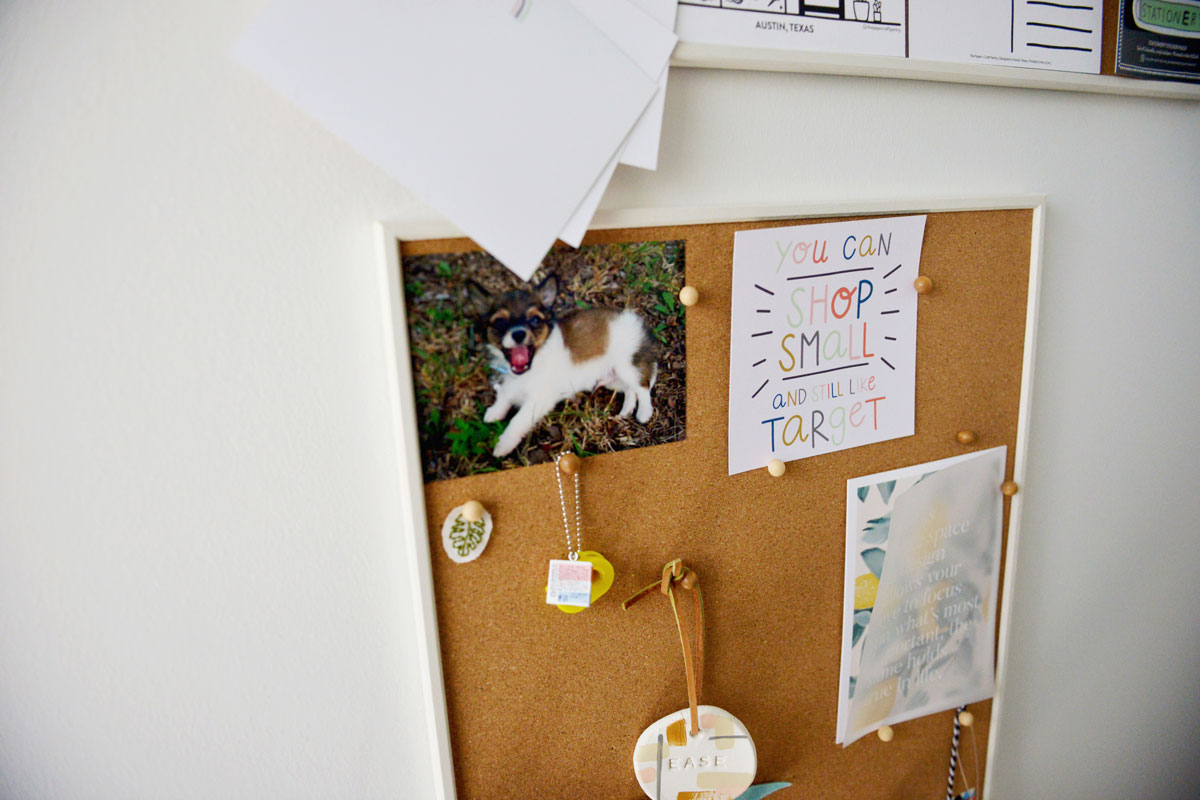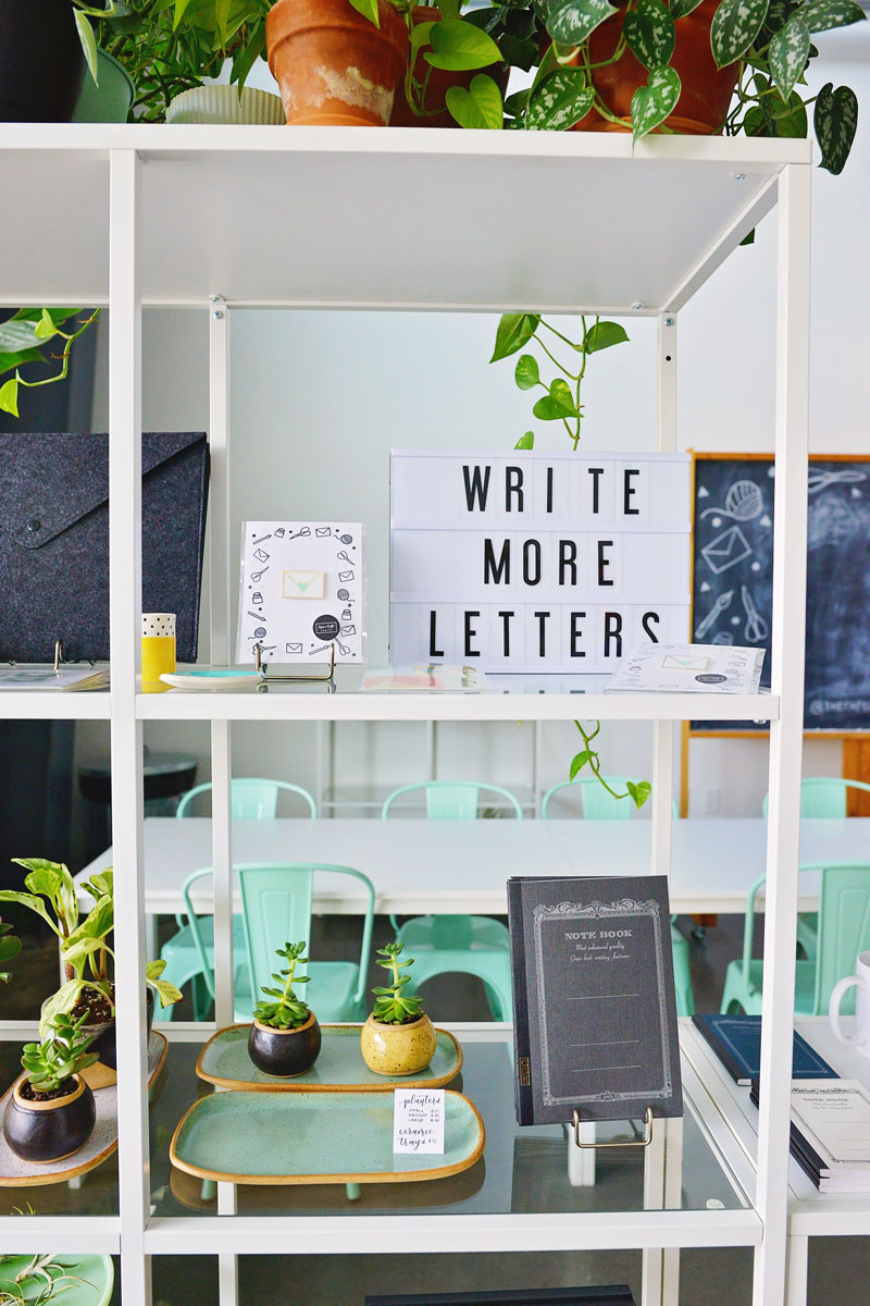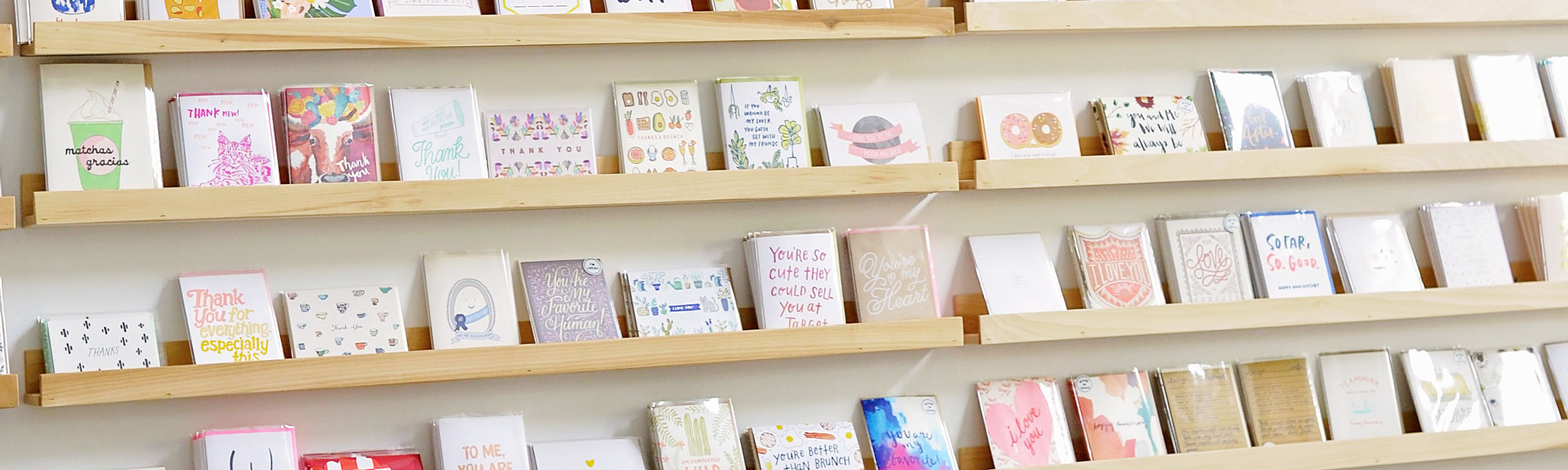 Looking up, the open-concept ceiling of industrial ductwork belies the store’s warmth. As eyes descend from the metal rafters down the white walls, the space fills with the soft colors of a 36-foot greeting card wall and milky pens, highlighters and markers sequestered in plastic cubbies. To the left is a cordoned-off area with chalkboard remnants of the last craft workshop hosted here.