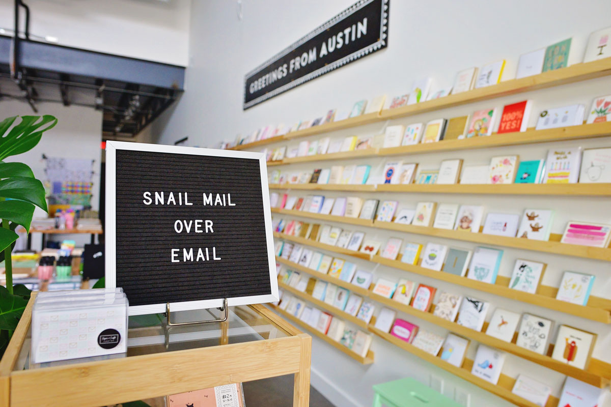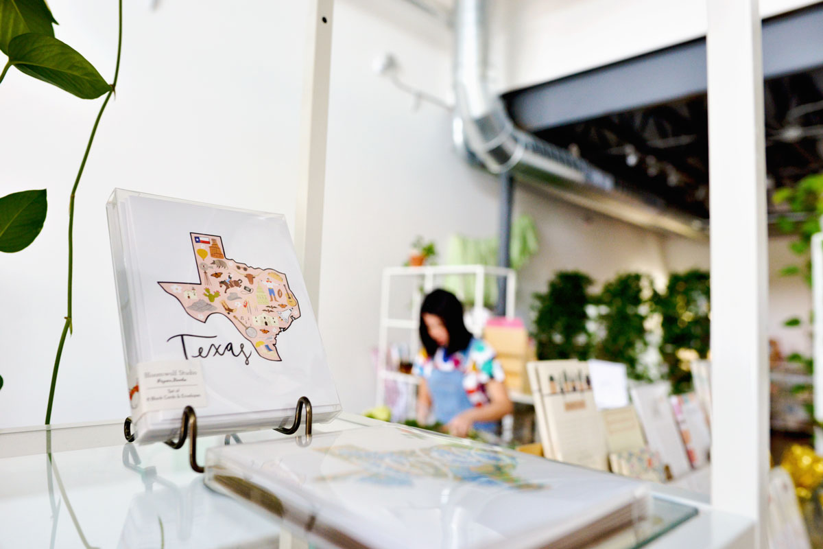 Walking through the doors of the East Austin storefront, one is greeted by the scattered pink, purple, green and blue hues of felt flowers, fresh notebooks, cotton candy-colored stationery and tiny potted plants.