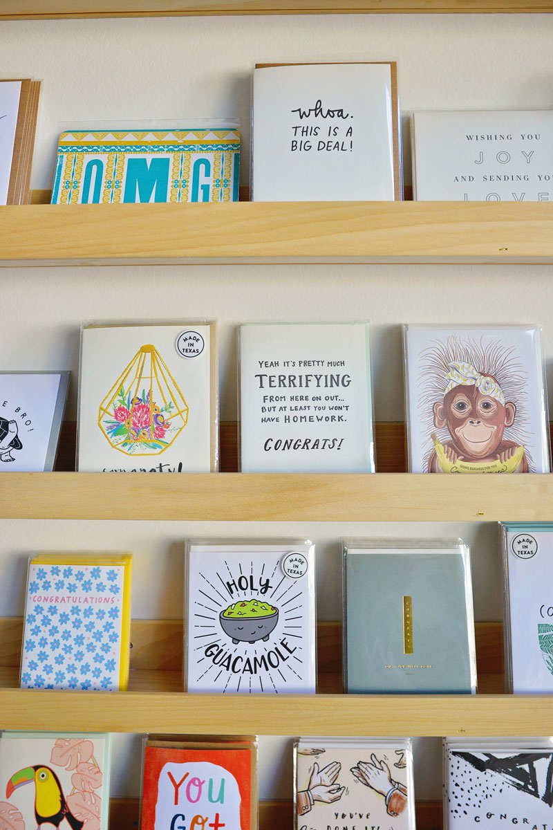 Running a business has certainly been a process for Sim. Days can be long and some customers unpleasant. There also is the matter of carrying all the responsibility of the business’ success on her shoulders. But most days, Sim finds her East Austin shop is a bit of a byway where life’s random moments converge, like the woman who bought a card monthly to mail to her fiancé serving in Germany. He unexpectedly dropped by the store one day to pick out a card in which to write his wedding vows.