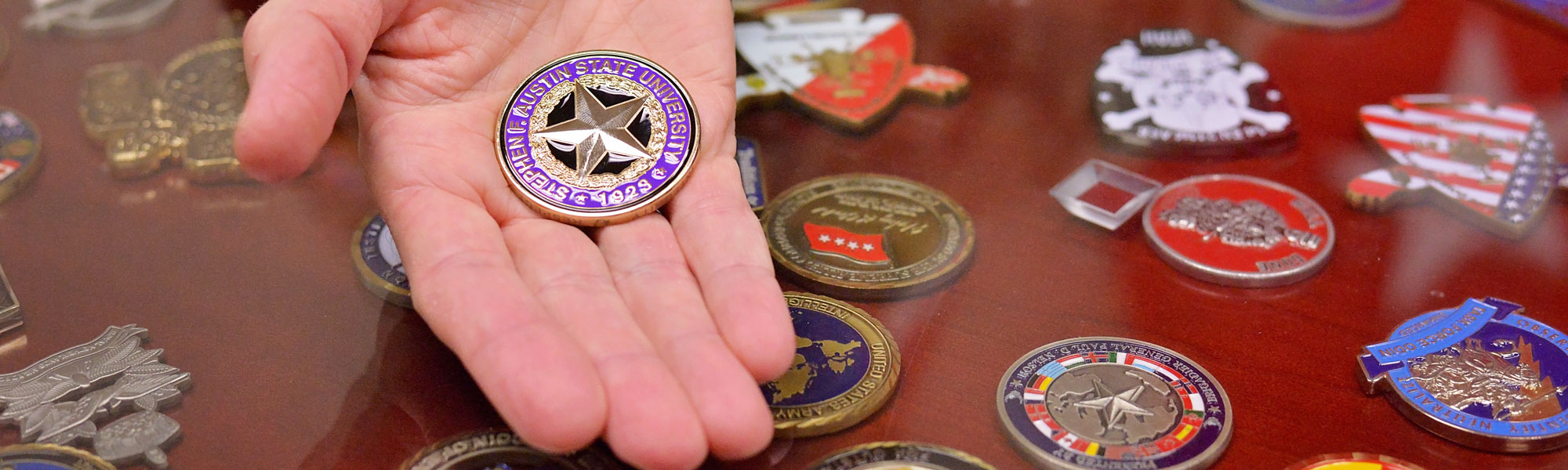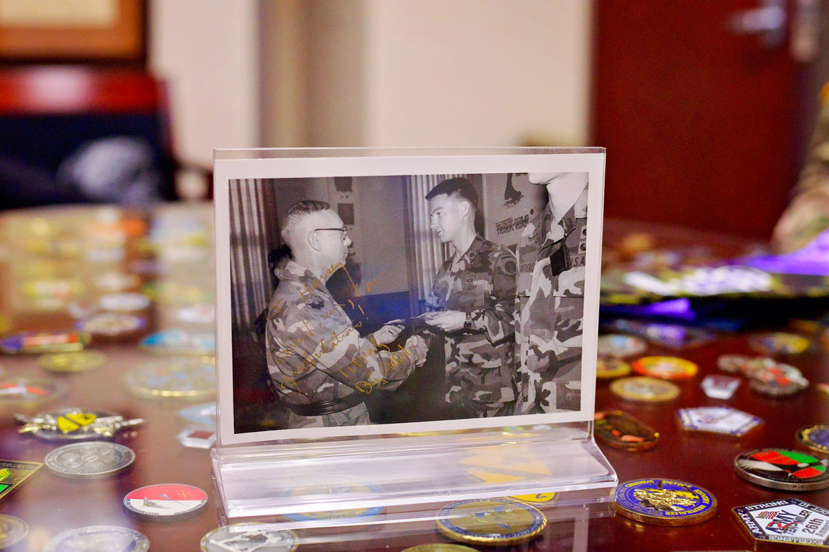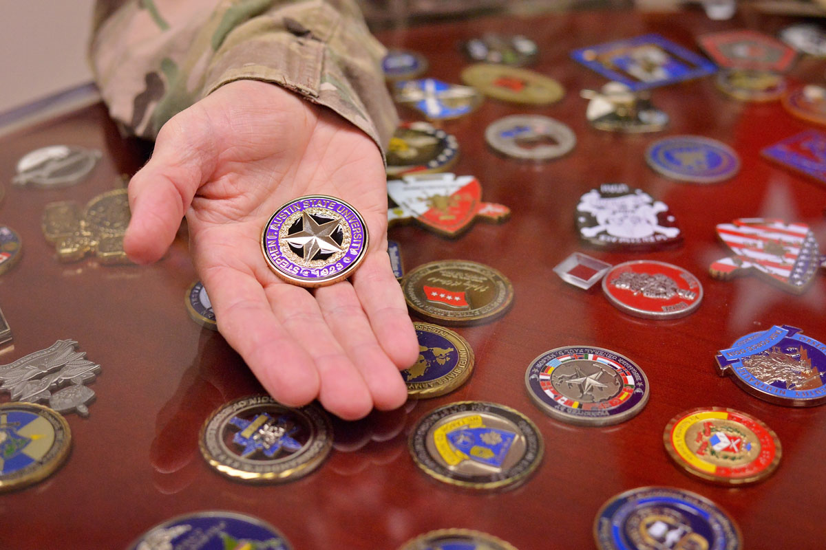 A sea of Army and Joint Commander coins for excellence lay beneath a thick layer of glass that covers a round table. “My plan was to get experience and then move over to law enforcement. But what I found was the mission, the people and the opportunities have continued to keep me in.”