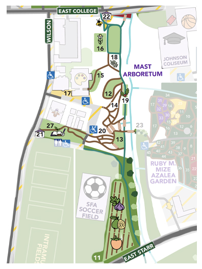 The Mast Arboretum is a 10-acre garden along Lanana Creek on the SFA campus and home to more than 7,500 species of plants, plus a variety of unique display gardens. The garden started in 1985 as a small project on the south side of the agriculture building and is the oldest university arboretum in Texas.