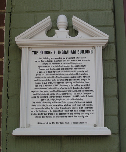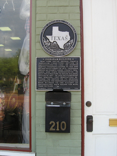 Believed to be the oldest intact building on the south side of the public square, the Ingraham building is a Registered Texas Historic Landmark (1998), and a Nacogdoches Historic Landmark.