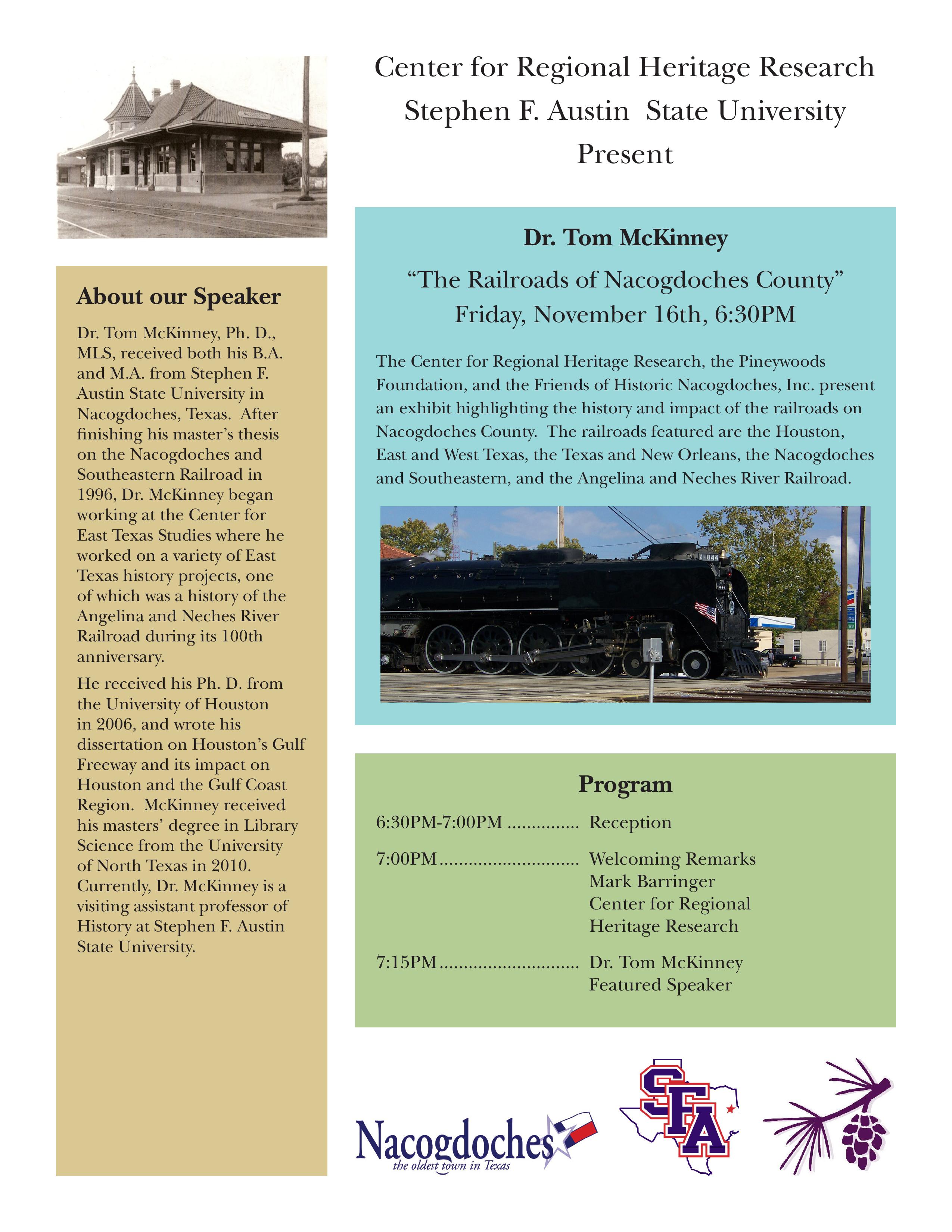 The Center for Regional Heritage Research, the Pineywoods Foundation, and the Friends of Historic Nacogdoches, Inc. present an exhibit highlighting the history and impact of the railroads on Nacogdoches County. The railroads featured are the Houston, East and West Texas, the Texas and New Orleans, the Nacogdoches and Southeastern, and the Angelina and Neches River Railroad.