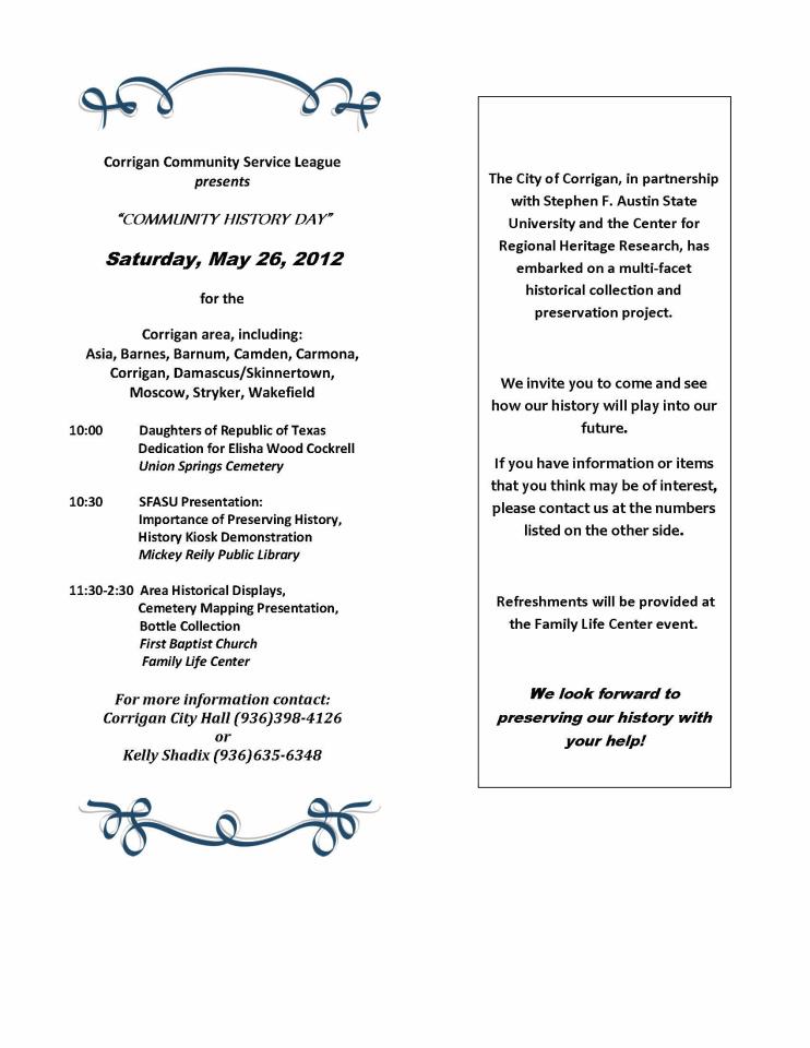 Presented by Corrigan Community Service League for the Corrigan area, including: Asia, Barnes, Barnum, Camden, Carmona, Corrigan, Damascus/Skinnertown, Moscow, Stryker, WakefieldSee flier for event schedule and details.