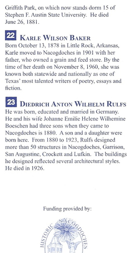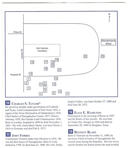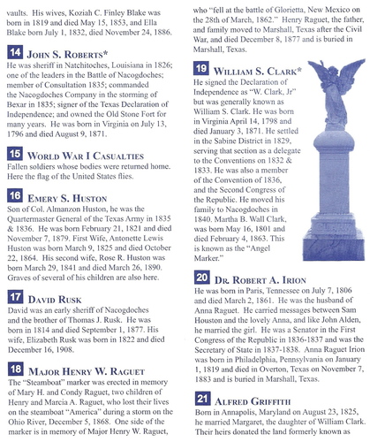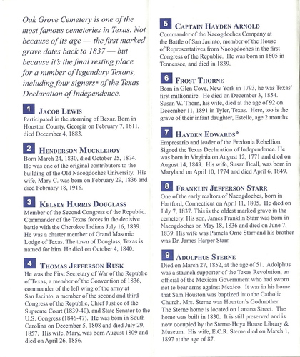 - Significance: One of the oldest known Anglo cemeteries in state; 4 signers of the Texas Declaration of Independence are buried here: Thomas J. Rusk; Charles S. Taylor, John S. Roberts.