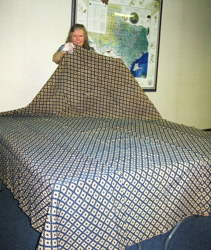 Initial research suggests it was woven in three segments using a loom and colored with homemade dyes. In the accompanying photograph Barbara Crossman is seen with the coverlet.