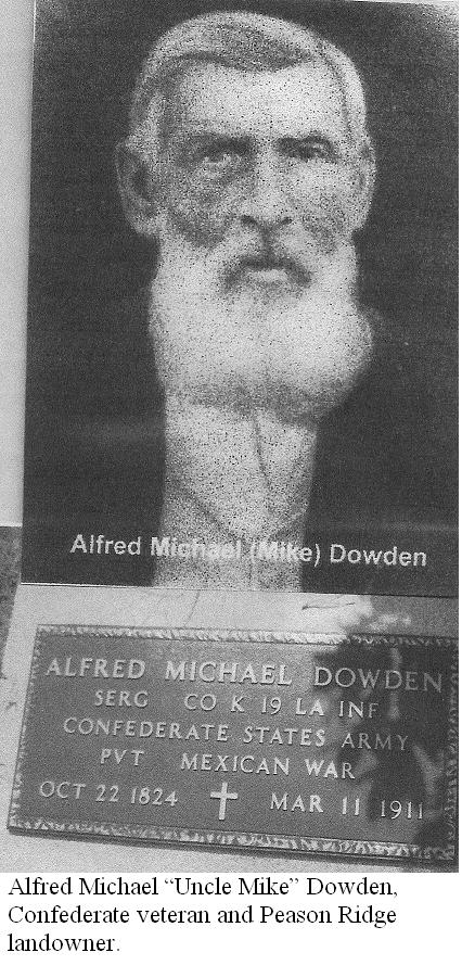 Alfred Michael (Uncle Mike) Dowden was a rugged pioneer of this area. In 1846 during the Mexican War he served in combat in Mexico. In 1861 when war clouds gathered, he walked to New Orleans and joined Co K 19th Louisiana Infantry Regiment. Being a combat veteran he made sergeant in his unit. The 19th Louisiana fought in the Battles of Shiloh, Corinth, Chickamauga, Missionary Ridge, Atlanta, Mill Creek Gap, and Nashville. They surrendered in Alabama on May 8, 1865. "Uncle Mike" returned home and raised his family. As he grew older, he made hand carved tombstones for his friends graves and would cry while making them. He is buried in the Billy Dowden Cemetery along with his son. Uncle Mike was a proud veteran of 2 wars.
