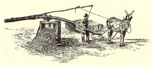 At the mill the cane would be run between rollers to press out the juice. A horse or a mule was harnessed to a pole and walked a slow, steady around and around in circles; the pole was attached to gears which turned the rollers of the mill.