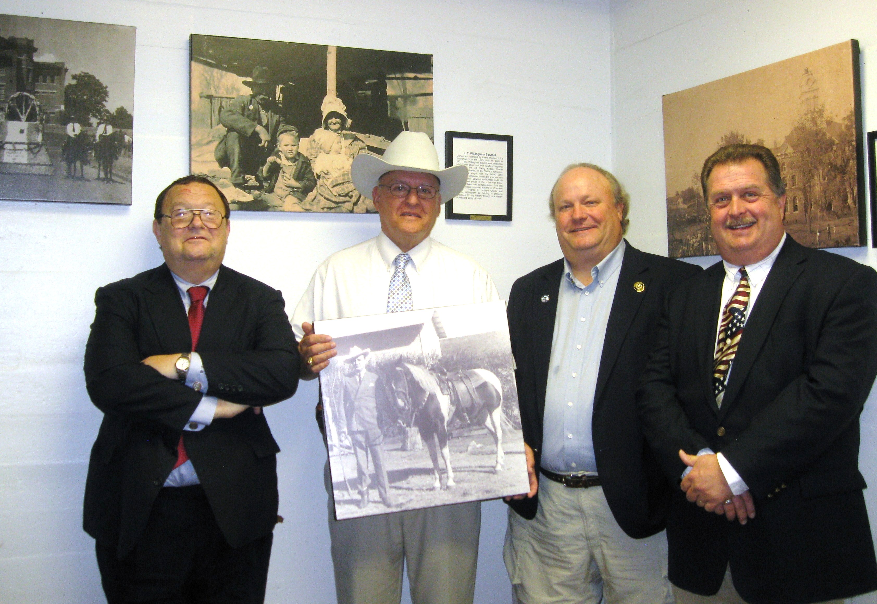 The Preservation Committee is seen presenting Sheriff James Campbell with a canvas of a rare 1930s photo of Sheriff Bill Brunt and his horse Traveler. Long known as a history buff and leader of preservation projects in both Anderson and Cherokee Counties, District Judge Bascom Bentley III speared headed this effort and is seen on the left. Next is Sheriff Campbell, then Jacksonville lawyer Ricky Richards, and County Judge Chris Davis. Not pictured is the final member of the committee, Deborah Burkett. She took this photo and is proud to be following in the footsteps of the photographer who is pictured standing atop the clock tower.