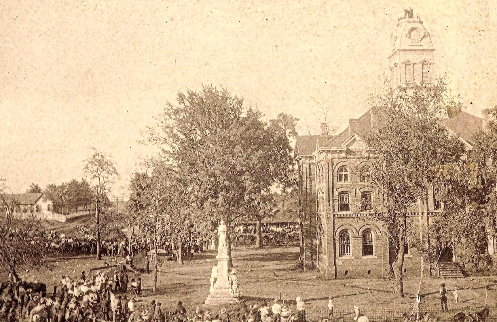 Horses and buggies can be seen on dirt streets in the background. A celebration of some sort is occurring, possibly a parade. In the foreground of this picture is the monument to Civil War dead in Cherokee County. Notice the lady standing at the monument; her attire suggests springtime or summer; also of interest is the fence surrounding the courthouse grounds. On the left one can see steps that allow people to pass over the fence; note a man sits and enjoys the view.