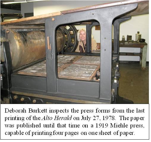 The Alto Herald built quite a reputation. As other newspapers in Texas changed to offset or computerized style of printing the Herald still used the 'hot type'--Linotype method of putting out a newspaper. Journalism students from Stephen F. Austin descended upon the Alto office. Under the guidance of Instructor Ben Hobbs they saw firsthand how a 'real' newspaper was printed.