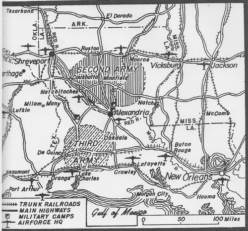 General Marshall appointed Lt. General Leslie McNair as director of all army training. By June of 1941 General McNair had nearly 1 million men ready to train. But where to train all these men ? In 1940 many small units began small scale maneuvers throughout the United States, but principally in the South. In Louisiana from June 1940 until the 1941 Maneuvers began in August and September 1941, small units of different branches of the Regular Army began training in Louisiana. And many young officers began learning tactics that would make them famous in World War II. Great shortages of equipment of all types were found. The new M-1 rifle was in short supply, blank ammunition was in short supply, field equipment of all types was in short supply or were old World War I era, and armored vehicles for the new Armored Force were limited. The 1940 Maneuvers brought out these shortages and by September 1941, the US Army was ready to conduct training with over 470,000 men on over 3400 square miles of maneuver lands in both Louisiana and Texas. Lt. Colonel Mark Clark had drawn out the maneuver area on a Louisiana filling station road map that encompassed this vast area. And to help out, Congress allocated the WHOLE 1942 Military Appropriations Act of 21 million dollars to spend on this great maneuver. To support the maneuver, camps such as Camp Polk, Livingston, Beauregard, and Claiborne were constructed, along with Army Air Fields at Lake Charles, DeRidder, Alexandria, Pineville, and Pollock. Over 19 full divisions were ready to maneuver, more than in the US Army today.