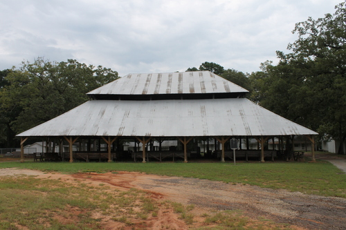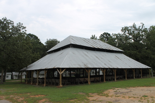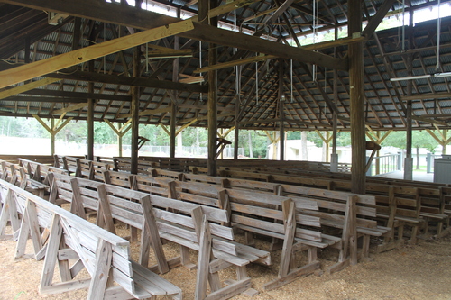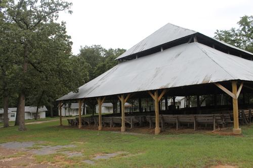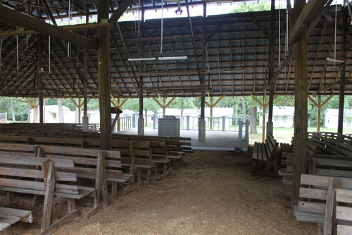 • Description: The Noonday Holiness Camp is an outdoor Vernaulcar camp underneath a hipped tin roof, supported by wooden posts. Wooden benches sit on a sawdust service looking towards a simple wooden platform. There are twelve camp houses behind the camp along with a large dinging hall.