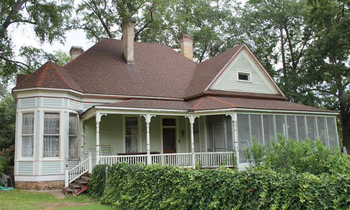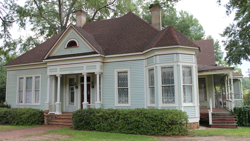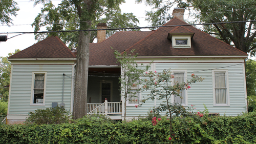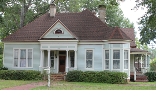 The Starr-Pope home is a one-story, frame Free Classical/Queen Anne structure with a small gabled porch supported by four classical columns that covers only the main entrance.