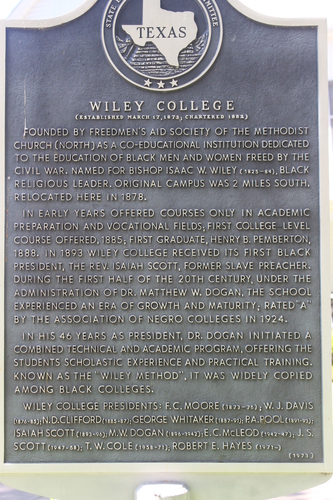 Wiley College was founded in 1873 by the Freedmen's Aid Society of the MEthodist church as an institution for the education of AFrican American men and women freed by the Civil War. In 1893, Isaiah S. Scott, a former slave pereacher, became the first African American to preside over the college. M.W. Dogan, Wiley president in the 1940s, initiated a program that offered students scholastic studies and practical training. This program, known as the "Wiley Method," was widely used by African-American colleges. The Dogan Hall on campus was named in his honor. (Images of America: Marshall, Joyce Williamson, Pat Smith-JGasperson, Lucile Estell, and the Harrison County Historical Museum).