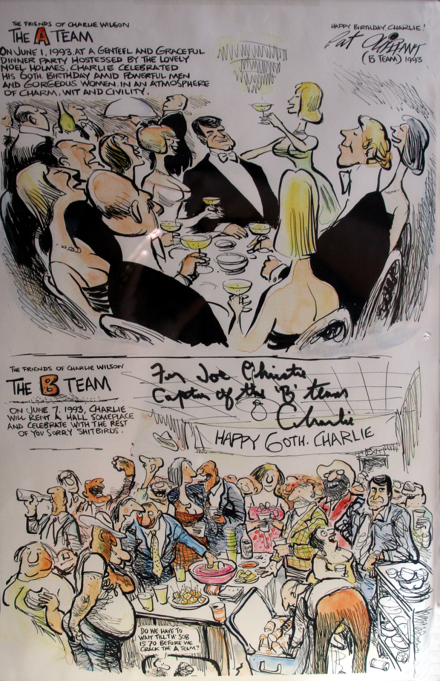CHRISTIE: It was. I mean, I was not . . . There were two big things I helped Charlie plan. One was his niece's big crown, the cherry blossom queen, in, Texas cherry blossom* queen or something like that. But all the members of the Texas delegation, the congress, would murder to get their daughters or granddaughters named that. And Charlie outmaneuvered all of them and got his niece [Elizabeth Allison] named that. And it was held in the Smithsonian, where they have the Constitution, you know. I remember going in there with a drink and kind of looking at the Constitution, just me and a couple others having a drink and looking at it, you know. So that was Charlie's, some evidence of Charlie's ability to really navigate the system. So he got that. And then the 60th birthday party was at the Kennedy Center. And he invited all the "[Charlie's] Angels back and a bunch of his old friends. Yeah, I helped plan that, but Charlie really kind of set the tone. You know, he had his tailor make his tux to look exactly like Rick . . . the theme was Casablanca. So he wanted his tux to look exactly like Humphrey Bogart's tuxedo in Casablanca. And, man it was great. We had a great time. Big band. I remember him dancing with some congressional, Patricia Schroeder, was that . . . .?