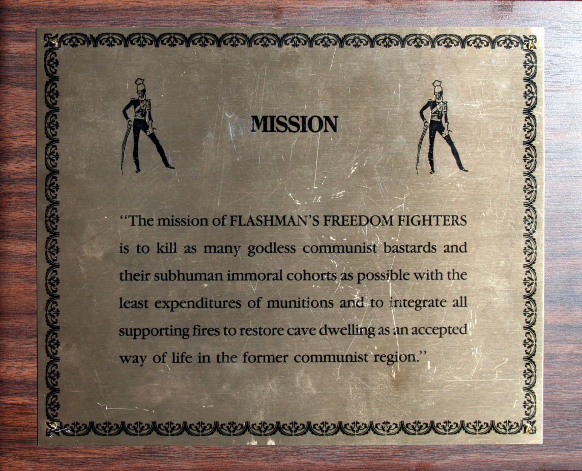 CHRISTIE: Okay. "The mission of Flashman's Freedom Fighters is to kill as many godless communist bastards and their subhuman immoral cohorts as possible. With the least expenditure of munitions and to integrate all supporting fires to restore cave dwellings as an accepted way of life in the former communist region."