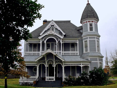 Rulfs's friend, John Schmidt, was a prominent citizen in Nacogdoches and upon the completion of his home in 1895, helped to establish Rulfs's reputation by commissioning him to build and renovate several of his downtown businesses and personal residences.[6] Rulfs brought with him the architectural styles he had learned in Europe. This included the use of colorful stained glass, detailed ornamentation, creative uses of materials and styles, and the catering to the needs of the family who would live in the home.[7] Rulfs began by building in the Victorian Queen Anne style, which is characterized by asymmetrical floor plans, bay windows, gables, stained glass, and gingerbread details.[8] Over the course of his career, Rulfs's style evolved and he mixed and matched Victorian style with other styles such as Gothic, Greek Revival, Bungalow, and Prairie.[9] Rulfs was well known for working with what he was given, both in using materials creatively and in taking into consideration the location, wind currents and the placement of windows. He also and adapted existing homes into larger and better functioning designs.[10]
