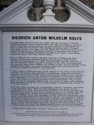 Diedrich Rulfs is significant in the history of Nacogdoches for his distincitve architectural designs, which can be seen throughout the city. To view or print a brochure about Rulfs, please click the following link Diedrich Rulfs Brochure, for more infomation, please continue reading. To view a brochure about Rulfs produced by the city, please click the following link The Legacy of Diedrich Rulfs Brochure