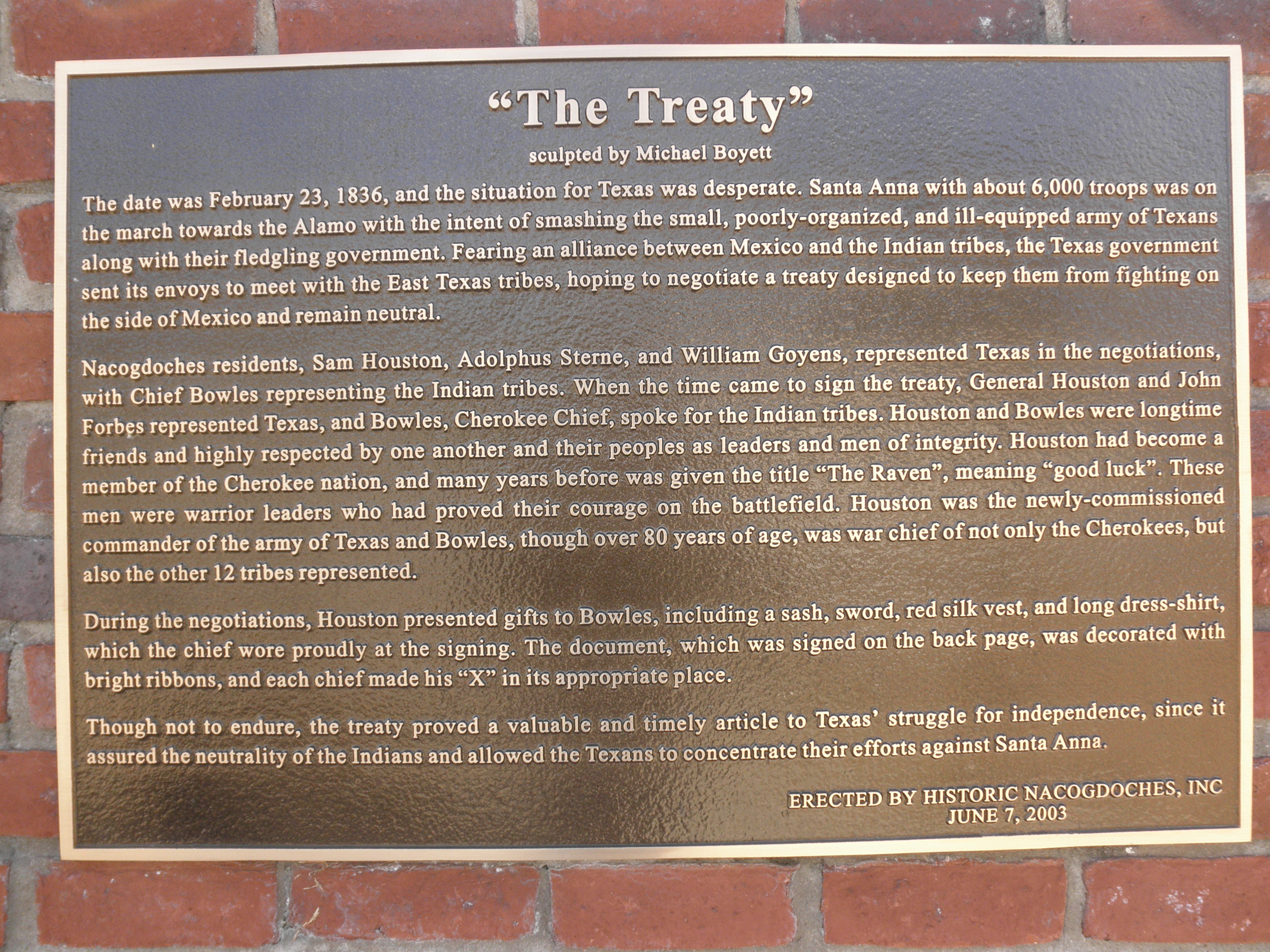 - "The Treaty" plaque at Eugenia Sterne Park, 700 East Main Street, Nacogdoches, Texas.