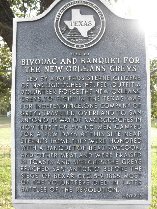 - Historical Marker for the Bivouac and Banquet for the New Orleans Greys, Across from Eugenia Sterne Park on Pillar Street, Nacogdoches, Texas.