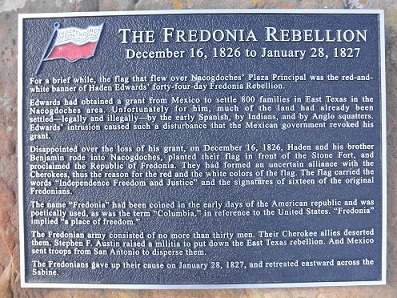 - The Fredonia Rebellion Marker, 206 East Main Street, Nacogdoches, Texas, http://digital.sfasu.edu/cdm/ref/collection/EastTexRC/id/21 .