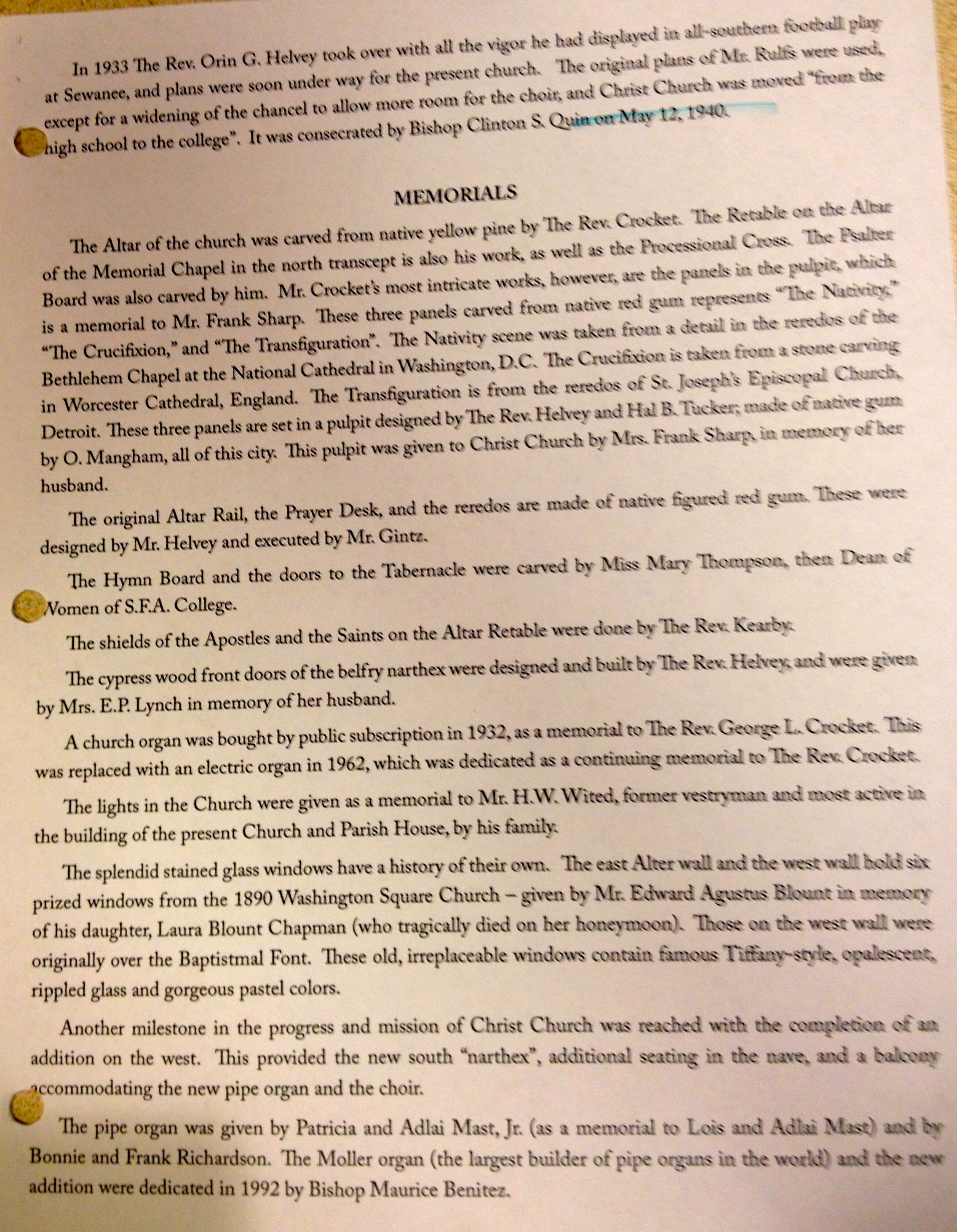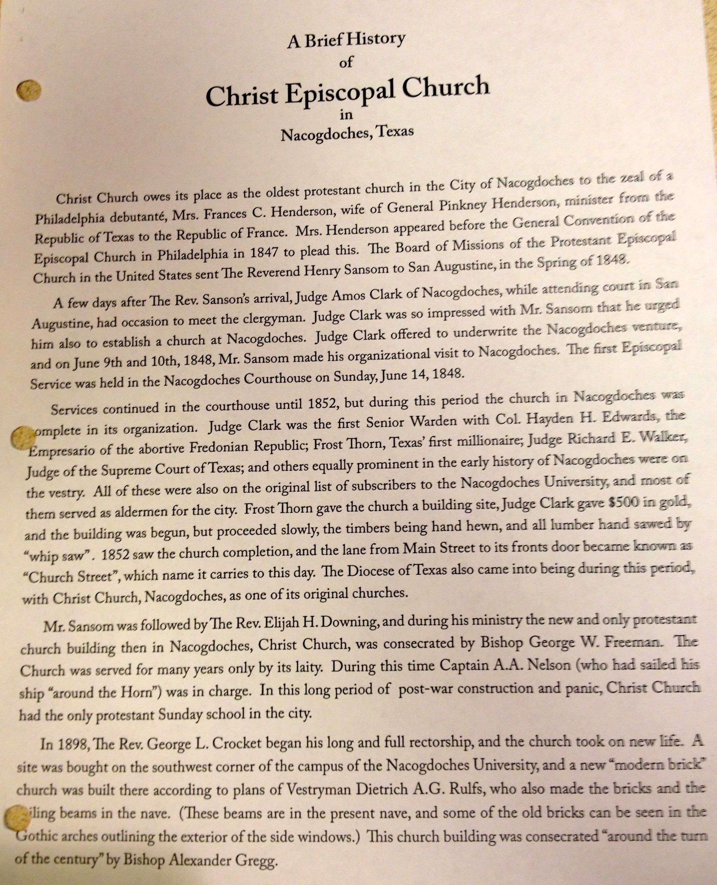 Special Comments: The church originally held services in the Nacogdoches courthouse from 1848-1852. 1852 the church moved into its own building on Church Street. They stayed there until the late 1930s when they moved to the corner of Starr and Mound. Throughout the rest of the 20th century, the church acquired many lots surrounding the corner lot, and expanded to include a separate office building and a pre-school.