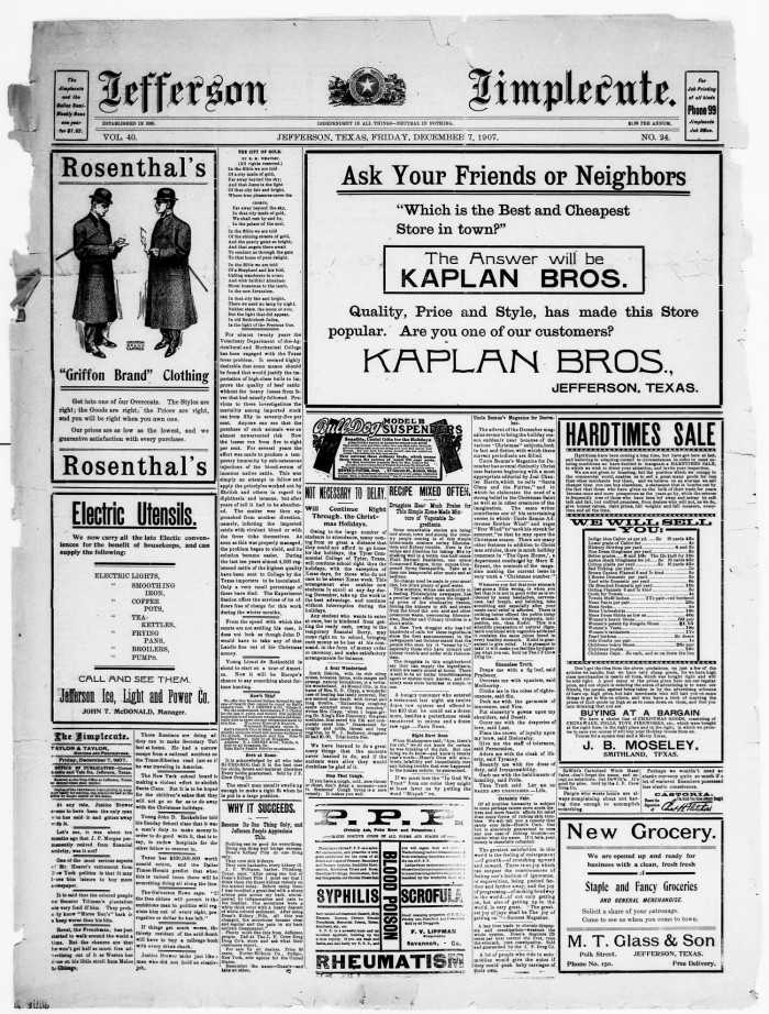 The Jefferson Jimplecute is the fifth oldest newspaper in the state of Texas. The paper was founded in 1848 by Ward Taylor. For over 150 years the "Jimp" has brought local news to the people of Jefferson and Marion County. Whereas numerous large American newspapers like the Rocky Mountain News, Albuquerque Tribune, and Honolulu Advertiser have bit the dust, it's amazing that the little Jimp has carried on. The rise of the internet and social media is slowing killing print news.
