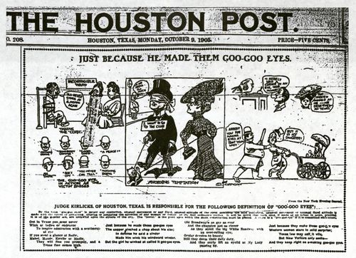 What exactly is meant by the term, goo-goo eyes? Returning to the fine print in the political cartoon above, one finds Judge Kirlicks in Houston laid down this description: "… the term 'goo-goo eyes' … meant any contortion, unusual movement or any fixed unusual attitude of the eyes, providing the said contortion, unusual movement, or unusual fixed attitude is made with the intent of attracting, alluring or conjuring the attention of any woman or female, as the ordinance recites. It will be noted that such eyes, if made at an infant in arms, provided it is of the gentler sex, is unlawful upon the streets of the city. A stare is a "goo-goo," if it is committed in intent; a wink accompanied by intent is a "goo-goo;" likewise the cocking of an eye, ogling, making wide eyes, all come within the broad sweep of the term 'goo-goo,' if accompanied by intent."